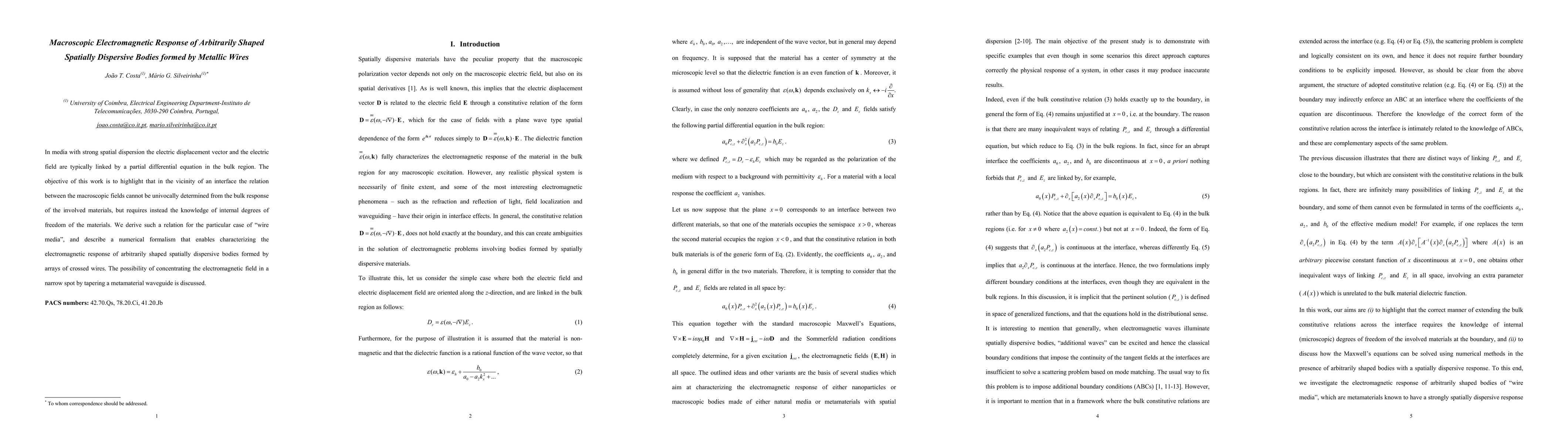 In media with strong spatial dispersion the electric displacement vector and the electric field are typically linked by a partial differential equation in the bulk region. The objective of this work is to highlight that in the vicinity of an interface the relation between the macroscopic fields cannot be univocally determined from the bulk response of the involved materials, but requires instead the knowledge of internal degrees of freedom of the materials. We derive such relation for the particular case of "wire media", and describe a numerical formalism that enables characterizing the electromagnetic response of arbitrarily shaped spatially dispersive bodies formed by arrays of crossed wires. The possibility of concentrating the electromagnetic field in a narrow spot by tapering a metamaterial waveguide is discussed.