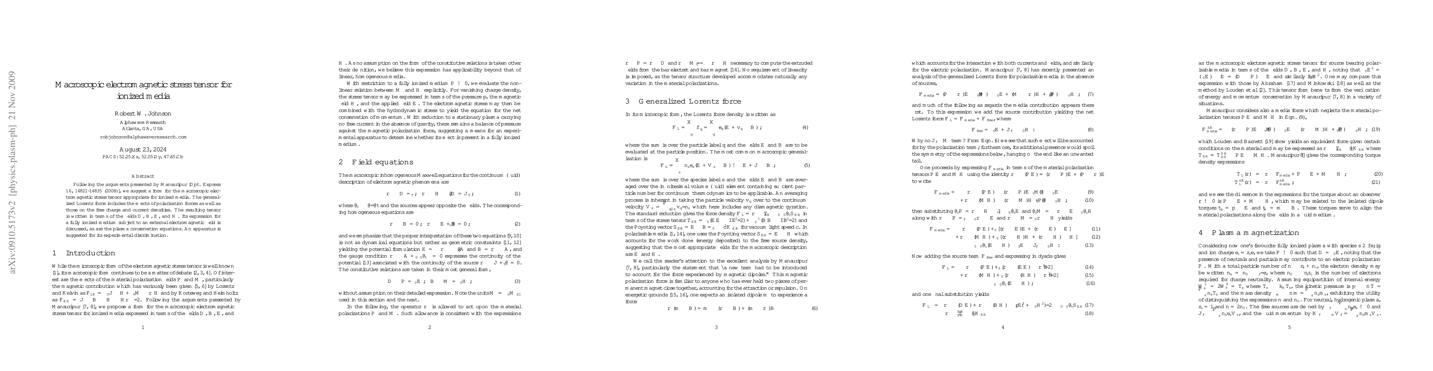 The paper presents a macroscopic electromagnetic stress tensor for ionized media, integrating the generalized Lorentz force and plasma conservation equations, providing a novel approach to understanding plasma dynamics under electromagnetic fields.
