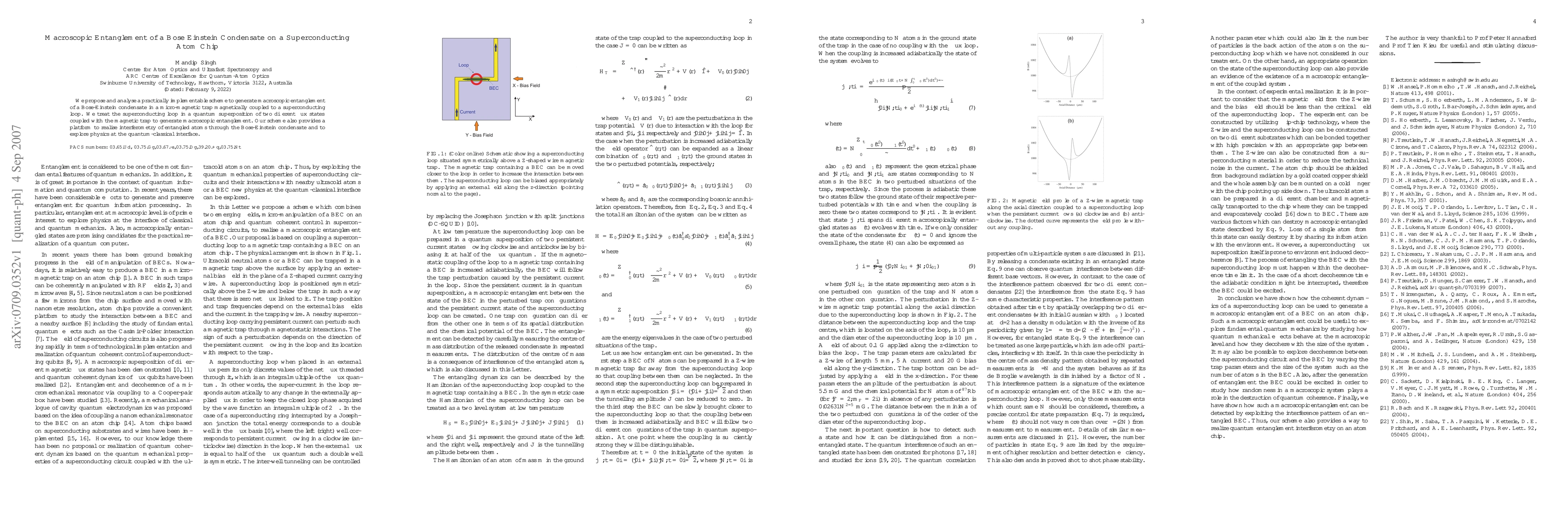 This paper proposes a method to generate macroscopic entanglement in a Bose-Einstein condensate using a superconducting atom chip, leveraging the quantum superposition of a superconducting loop's flux states. The scheme also enables interferometry of entangled atoms and studies at the quantum-classical interface.