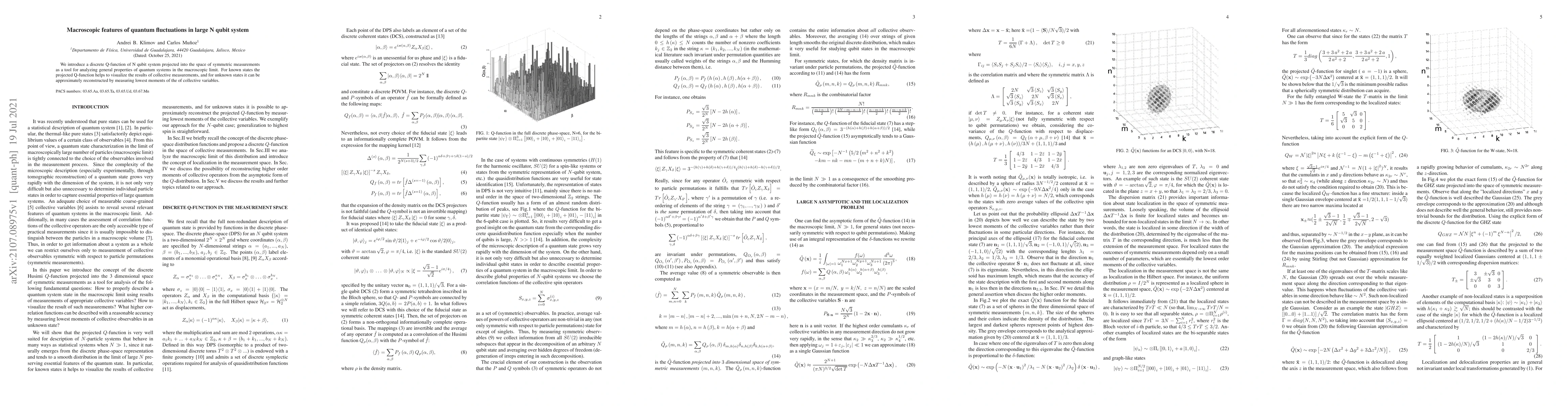We introduce a discrete Q-function of N qubit system projected into the space of symmetric measurements as a tool for analyzing general properties of quantum systems in the macroscopic limit. For known states the projected Q-function helps to visualize the results of collective measurements, and for unknown states it can be approximately reconstructed by measuring lowest moments of the of collective variables.