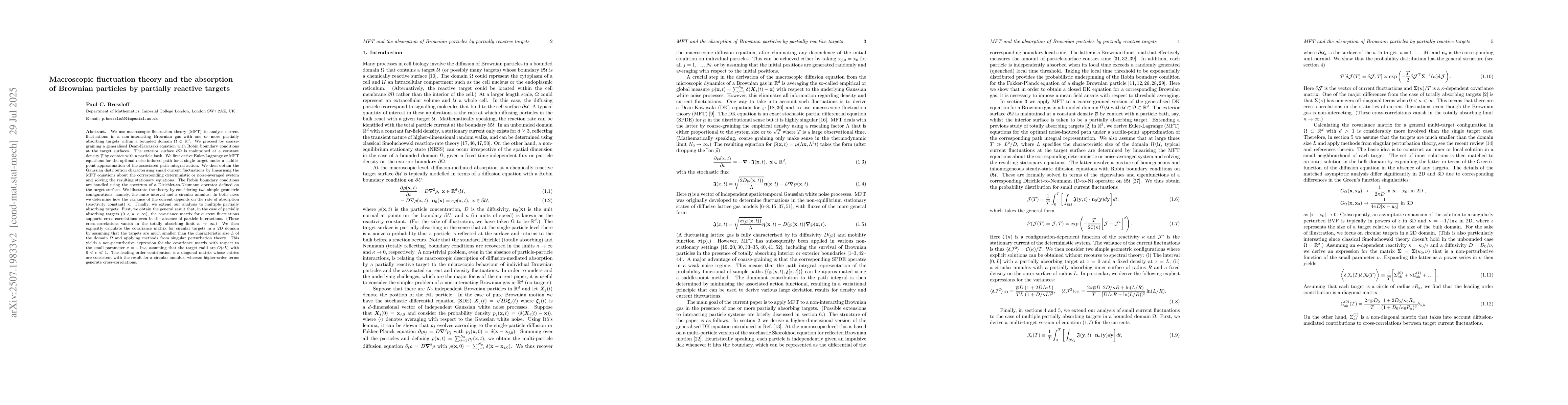 We use macroscopic fluctuation theory (MFT) to analyse current fluctuations in a non-interacting Brownian gas with one or more partially absorbing targets within a bounded domain $\Omega \subset \R^d$. We proceed by coarse-graining a generalised Dean-Kawasaki equation with Robin boundary conditions at the target surfaces. The exterior surface $\partial \Omega$ is maintained at a constant density $\owp$. We first derive MFT equations for the optimal noise-induced path for a single target under a saddle-point approximation of the associated path integral action. We then obtain the Gaussian distribution characterising small current fluctuations by linearising the MFT equations about the corresponding deterministic or noise-averaged system and solving the resulting stationary equations. The Robin boundary conditions are handled using the spectrum of a Dirichlet-to-Neumann operator defined on the target surface. We illustrate the theory by considering the finite interval and a circular annulus. In both cases we determine how the variance of the current depends on the rate of absorption $\kappa$. Finally, we extend our analysis to multiple partially absorbing targets. First, we obtain the general result that, in the case of partially absorbing targets ($0<\kappa<\infty$), the covariance matrix for current fluctuations supports cross correlations even in the absence of particle interactions. (These cross-correlations vanish in the totally absorbing limit $\kappa\rightarrow \infty$.) We then explicitly calculate the covariance matrix for circular targets in a 2D domain by assuming that the targets are much smaller than the characteristic size $L$ of the domain $\Omega$ and applying methods from singular perturbation theory.