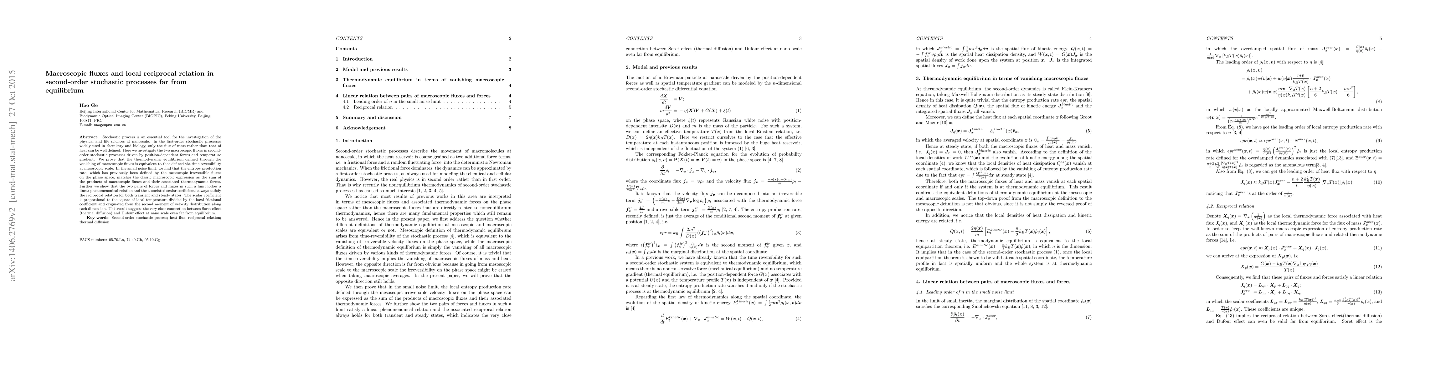 Stochastic process is an essential tool for the investigation of the physical and life sciences at nanoscale. In the first-order stochastic processes widely used in chemistry and biology, only the flux of mass rather than that of heat can be well defined. Here we investigate the two macroscopic fluxes in second-order stochastic processes driven by position-dependent forces and temperature gradient. We prove that the thermodynamic equilibrium defined through the vanishing of macroscopic fluxes is equivalent to that defined via time reversibility at mesoscopic scale. In the small noise limit, we find that the entropy production rate, which has previously been defined by the mesoscopic irreversible fluxes on the phase space, matches the classic macroscopic expression as the sum of the products of macroscopic fluxes and their associated thermodynamic forces. Further we show that the two pairs of forces and fluxes in such a limit follow a linear phenomenonical relation and the associated scalar coefficients always satisfy the reciprocal relation for both transient and steady states. The scalar coefficient is proportional to the square of local temperature divided by the local frictional coefficient and originated from the second moment of velocity distribution along each dimension. This result suggests the very close connection between Soret effect (thermal diffusion) and Dufour effect at nano scale even far from equilibrium.