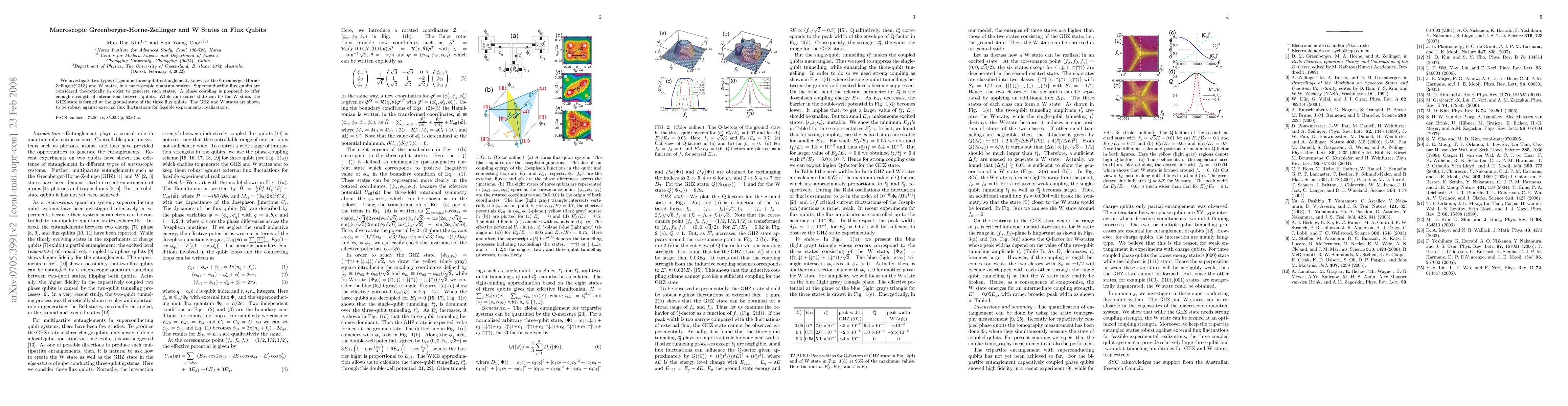 This paper explores the generation of macroscopic three-qubit GHZ and W states using superconducting flux qubits, proposing a phase coupling mechanism to achieve strong qubit interactions. The GHZ state is found in the ground state, while the W state can be in an excited state, both demonstrating robustness against external flux fluctuations.