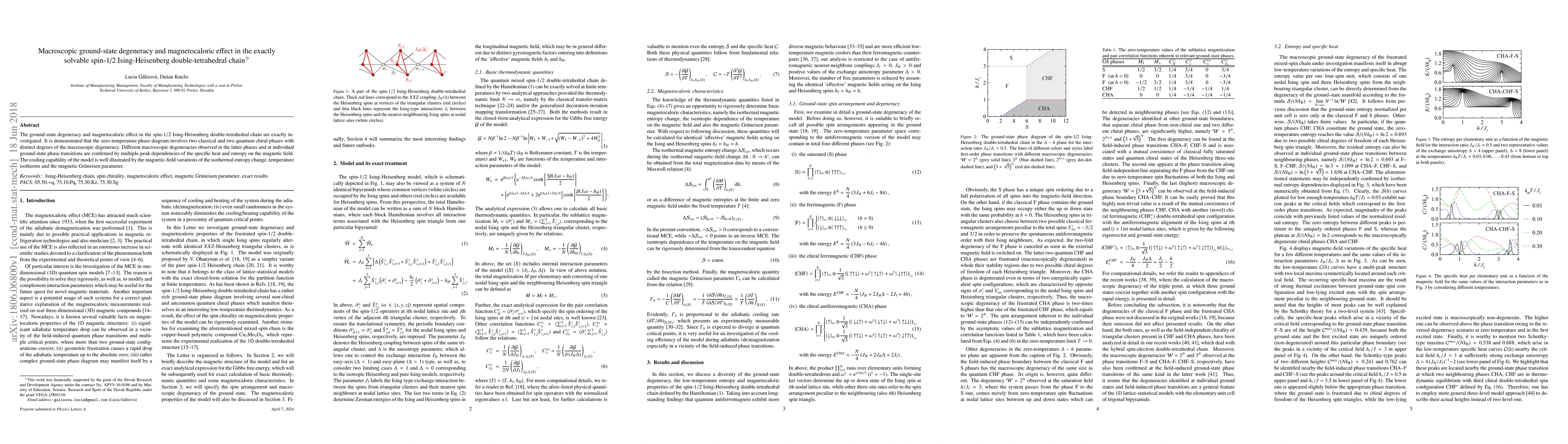This paper investigates the ground-state degeneracy and magnetocaloric effect in a spin-1/2 Ising-Heisenberg double-tetrahedral chain, revealing two classical and two quantum chiral phases with distinct macroscopic degeneracies, confirmed by specific heat and entropy dependencies on magnetic field. The study highlights the model's cooling capability through variations in isothermal entropy change and magnetic Gr\"uneisen parameter.