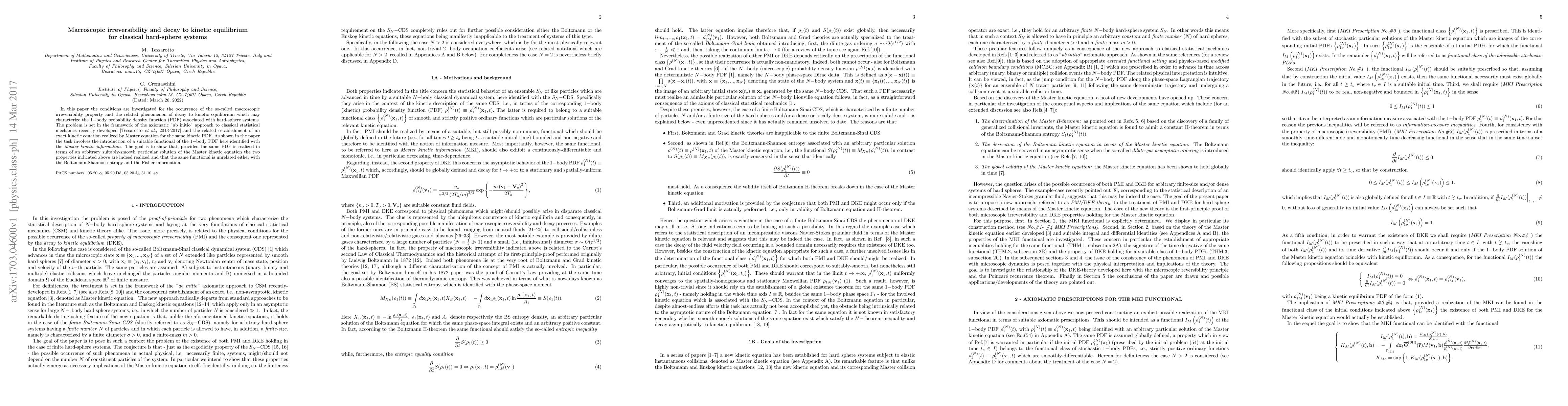 In this paper the conditions are investigated for the occurrence of the so-called macroscopic irreversibility property and the related phenomenon of decay to kinetic equilibrium which may characterize the $1-$body probability density function (PDF) associated with hard-sphere systems. The problem is set in the framework of the axiomatic "ab initio" approach to classical statistical mechanics recently developed [Tessarotto \textit{et al}., 2013-2017] and the related establishment of an exact kinetic equation realized by Master equation for the same kinetic PDF. As shown in the paper the task involves the introduction of a suitable functional of the $1-$body PDF here identified with the \textit{Master kinetic information}. The goal is to show that, provided the same PDF is realized in terms of an arbitrary suitably-smooth particular solution of the Master kinetic equation the two properties indicated above are indeed realized and that the same functional is unrelated either with the Boltzmann-Shannon entropy and the Fisher information.