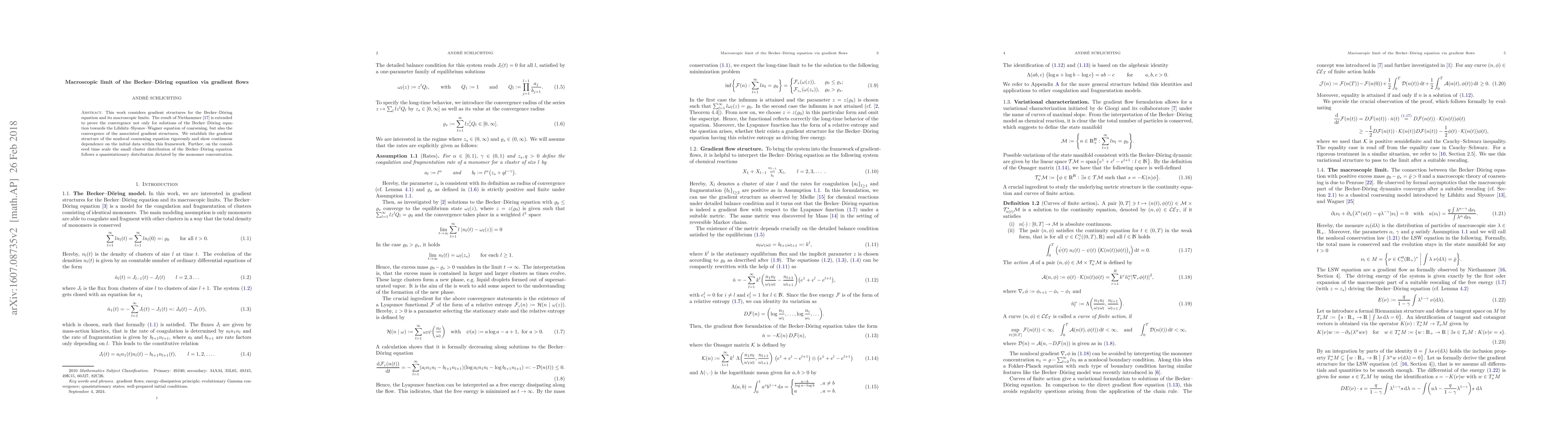 This paper extends Niethammer's results to rigorously prove the convergence of solutions and gradient structures from the Becker-Döring equation to the Lifshitz-Slyozov-Wagner equation, establishing the gradient structure of the nonlocal coarsening equation and demonstrating continuous dependence on initial data. The small cluster distribution in the Becker-Döring equation is shown to follow a quasistationary distribution based on monomer concentration.