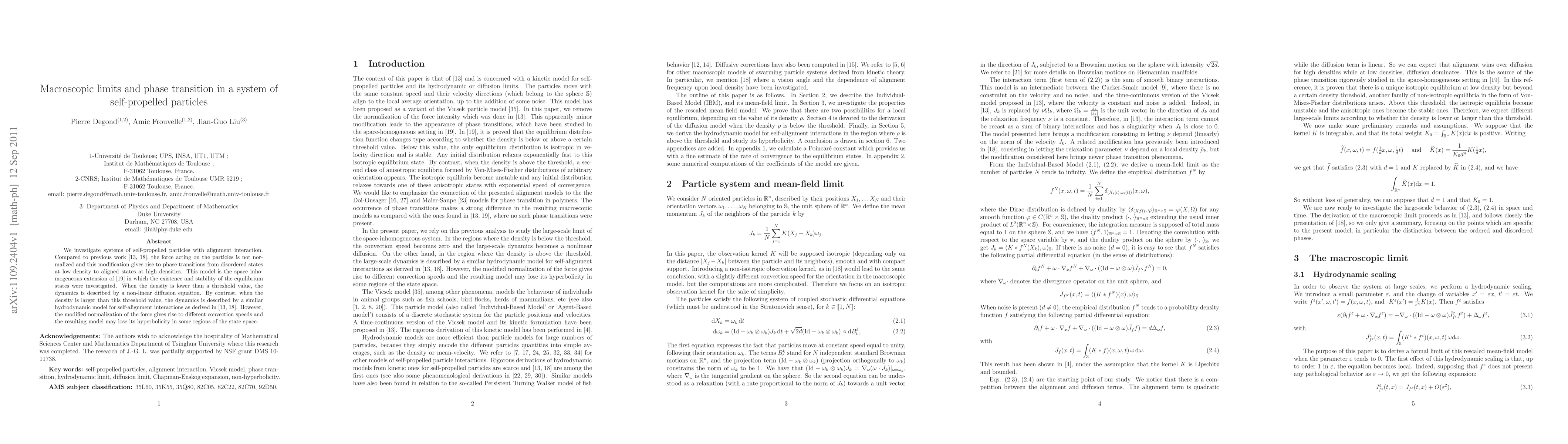 This research explores systems of self-propelled particles with alignment interactions, revealing phase transitions from disordered to aligned states based on density. The model, an extension of previous work, uses unnormalized forces, leading to different convection speeds and potential loss of hyperbolicity in certain state-space regions. At lower densities, the dynamics are governed by a non-linear diffusion equation, while at higher densities, a self-alignment hydrodynamic model applies.