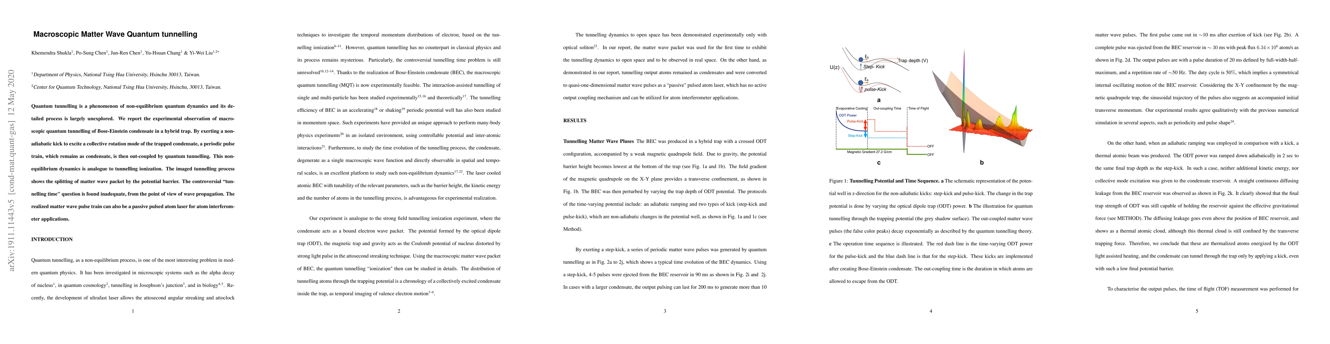 Quantum tunneling is a phenomenon of non-equilibrium quantum dynamics and its detailed process is largely unexplored. We report the experimental observation of macroscopic quantum tunneling of Bose-Einstein Condensate in a hybrid trap. By exerting a non-adiabatic kick to excite a collective rotation mode of the trapped condensate, a periodic pulse train, which remains as condensate, is then out-coupled by quantum tunneling. This non-equilibrium dynamics is analogue to tunneling ionization. The imaged tunneling process shows the splitting of matter-wave packet by the potential barrier. The controversial "tunneling time" question is found inadequate, from the point of view of wave propagation. The realized matter-wave pulse train can also be a passive pulsed atom laser for atom interferometer applications.