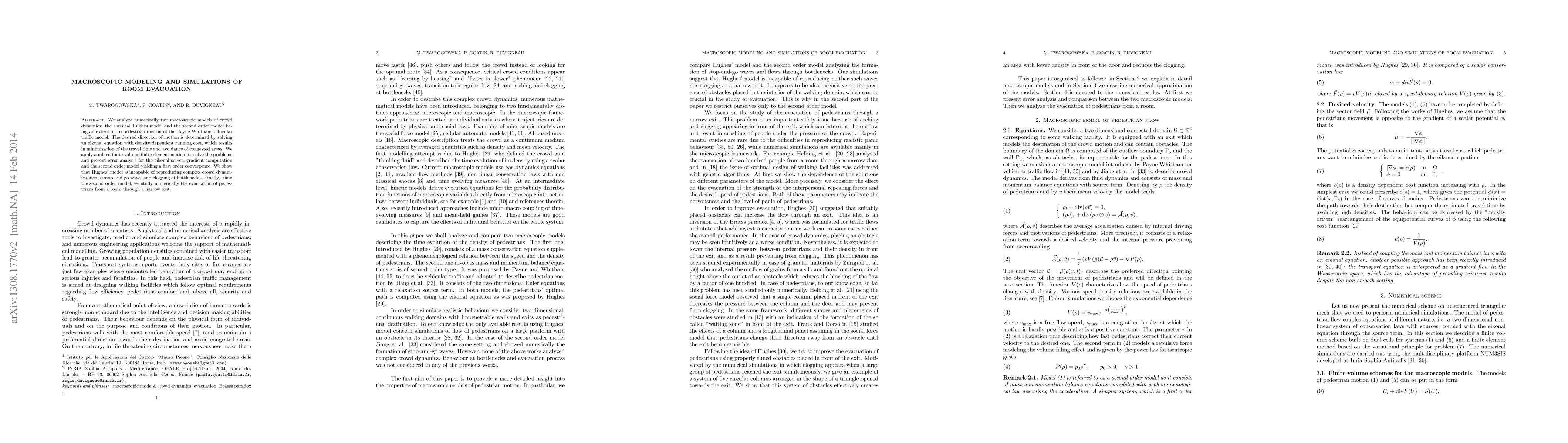 We analyze numerically two macroscopic models of crowd dynamics: the classical Hughes model and the second order model being an extension to pedestrian motion of the Payne-Whitham vehicular traffic model. The desired direction of motion is determined by solving an eikonal equation with density dependent running cost, which results in minimization of the travel time and avoidance of congested areas. We apply a mixed finite volume-finite element method to solve the problems and present error analysis for the eikonal solver, gradient computation and the second order model yielding a first order convergence. We show that Hughes' model is incapable of reproducing complex crowd dynamics such as stop-and-go waves and clogging at bottlenecks. Finally, using the second order model, we study numerically the evacuation of pedestrians from a room through a narrow exit.