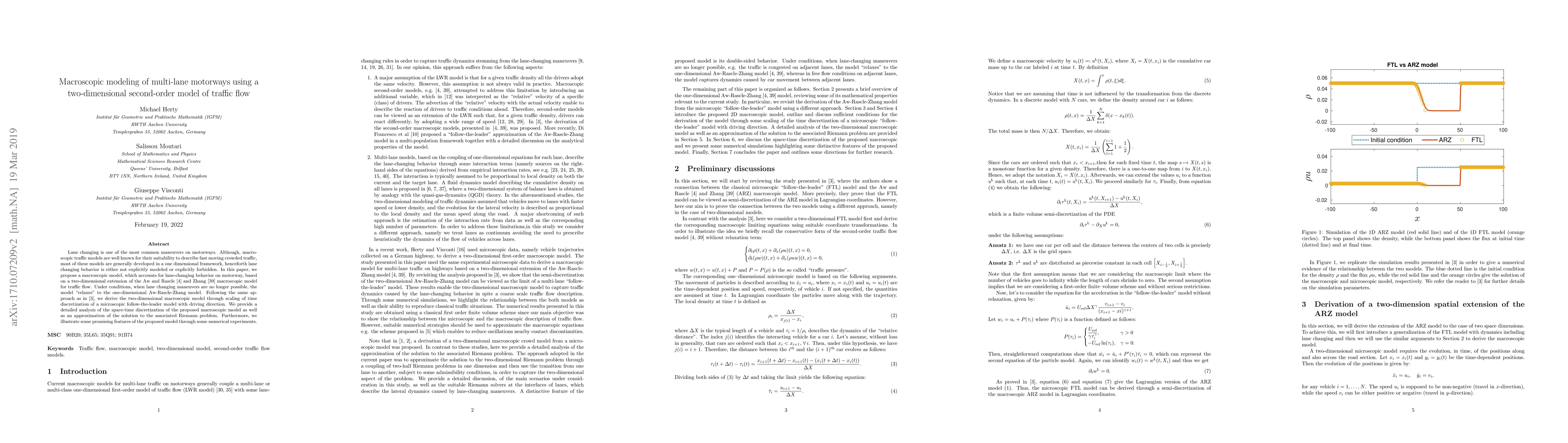 This paper proposes a two-dimensional macroscopic model for multi-lane motorway traffic that incorporates lane-changing behavior, extending the Aw-Rascle-Zhang model. The model reverts to a one-dimensional form when lane changes are not feasible, and it is validated through numerical experiments and analysis of the Riemann problem.