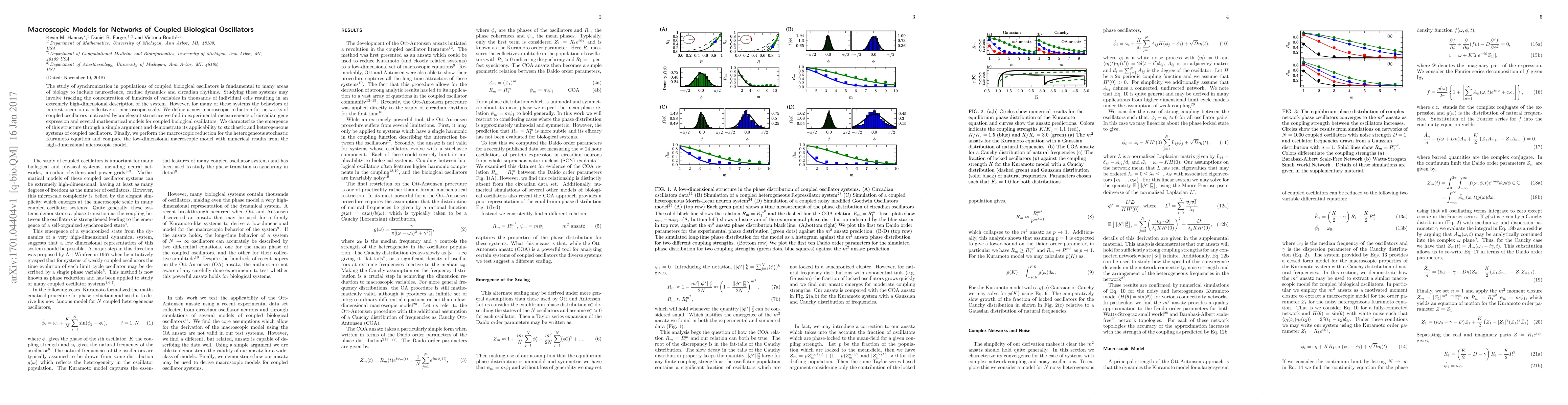 This paper introduces a new macroscopic reduction model for networks of coupled biological oscillators, demonstrating its applicability to stochastic and heterogeneous systems. It compares the reduced model's performance with high-dimensional microscopic simulations, showing its effectiveness in capturing collective behaviors.