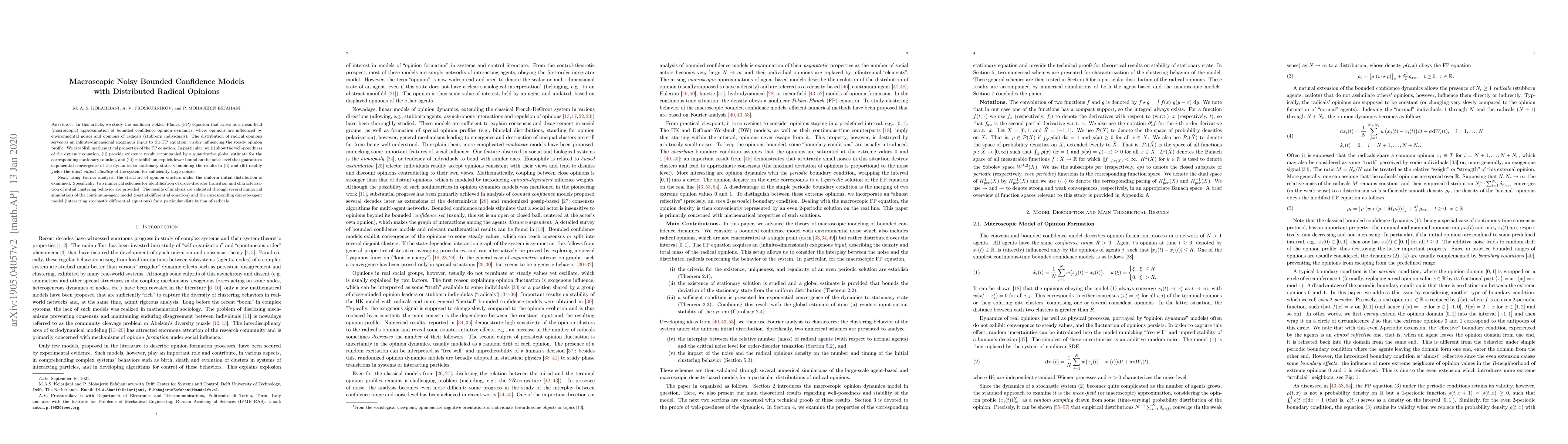 This paper investigates the nonlinear Fokker-Planck equation for bounded confidence opinion dynamics influenced by environmental noise and radical opinions, establishing its well-posedness, existence of a stationary solution, and exponential convergence under sufficient noise. Numerical schemes identify opinion clusters and validate the model through simulations.