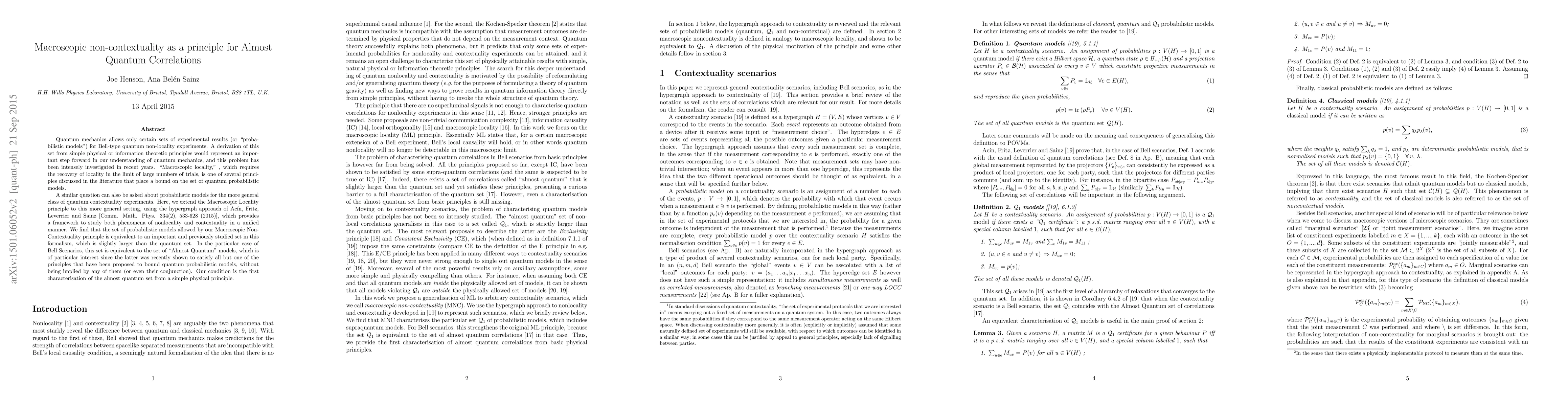 Quantum mechanics allows only certain sets of experimental results (or "probabilistic models") for Bell-type quantum non-locality experiments. A derivation of this set from simple physical or information theoretic principles would represent an important step forward in our understanding of quantum mechanics, and this problem has been intensely investigated in recent years. "Macroscopic locality," which requires the recovery of locality in the limit of large numbers of trials, is one of several principles discussed in the literature that place a bound on the set of quantum probabilistic models. A similar question can also be asked about probabilistic models for the more general class of quantum contextuality experiments. Here, we extend the Macroscopic Locality principle to this more general setting, using the hypergraph approach of Ac\'in, Fritz, Leverrier and Sainz [Comm. Math. Phys. 334(2), 533-628 (2015)], which provides a framework to study both phenomena of nonlocality and contextuality in a unified manner. We find that the set of probabilistic models allowed by our Macroscopic Non-Contextuality principle is equivalent to an important and previously studied set in this formalism, which is slightly larger than the quantum set. In the particular case of Bell Scenarios, this set is equivalent to the set of "Almost Quantum" models, which is of particular interest since the latter was recently shown to satisfy all but one of the principles that have been proposed to bound quantum probabilistic models, without being implied by any of them (or even their conjunction). Our condition is the first characterisation of the almost quantum set from a simple physical principle.