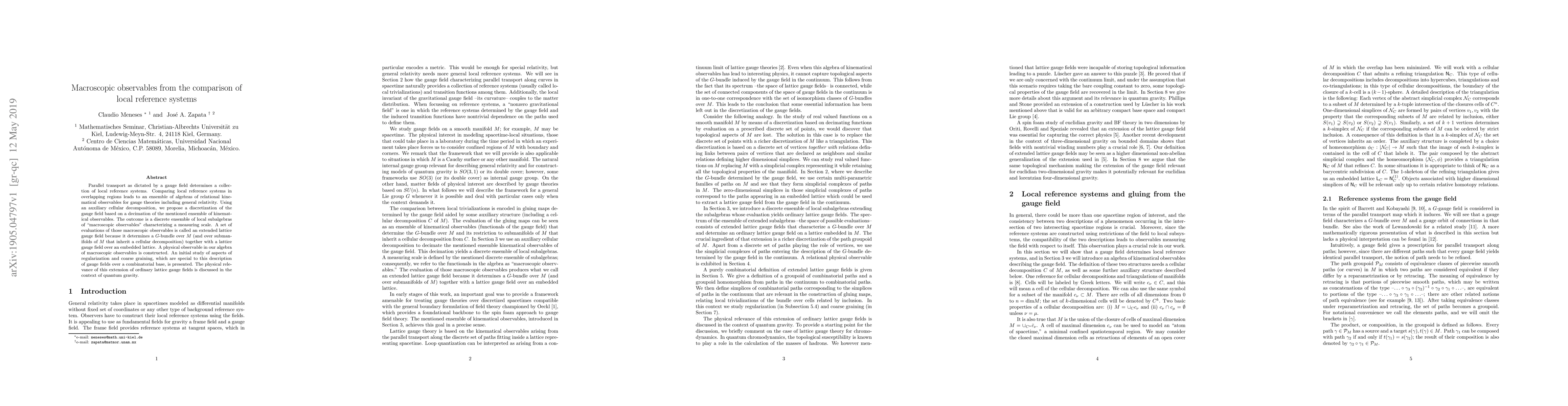 This paper proposes a method to derive macroscopic observables from local reference systems in gauge theories, including general relativity, using a cellular decomposition and lattice gauge fields. It introduces an extended lattice gauge field framework and discusses its physical relevance in the context of quantum gravity, including regularization and coarse graining aspects.