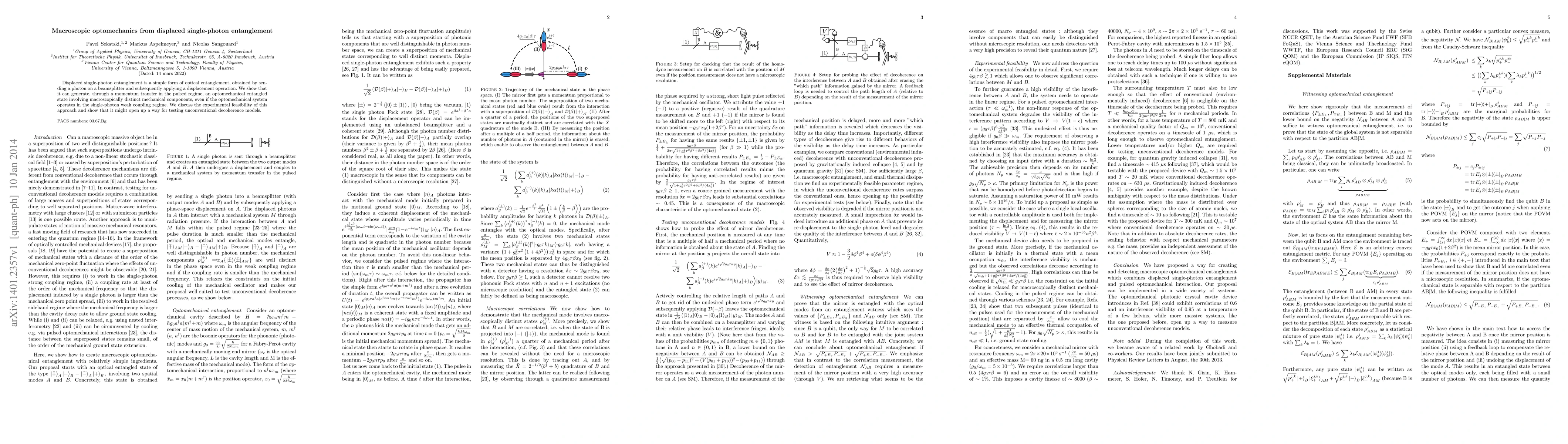 This paper demonstrates that displaced single-photon entanglement can create optomechanical entangled states involving macroscopically distinct mechanical components, even under weak coupling conditions. The study also explores the experimental feasibility and potential applications in testing unconventional decoherence models.