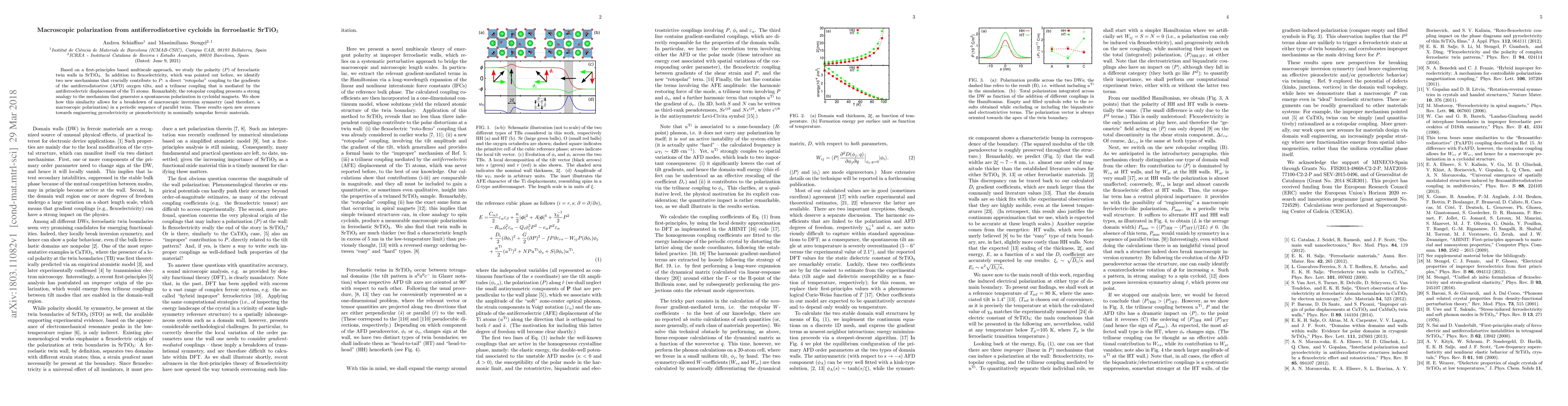 This paper investigates the polarity in ferroelastic twin walls of SrTiO$_3$ using a first-principles multiscale approach, identifying two new mechanisms contributing to polarity: a direct "rotopolar" coupling to antiferrodistortive oxygen tilts and a trilinear coupling via Ti atom displacements. These findings suggest a way to engineer pyroelectricity or piezoelectricity in nonpolar materials.