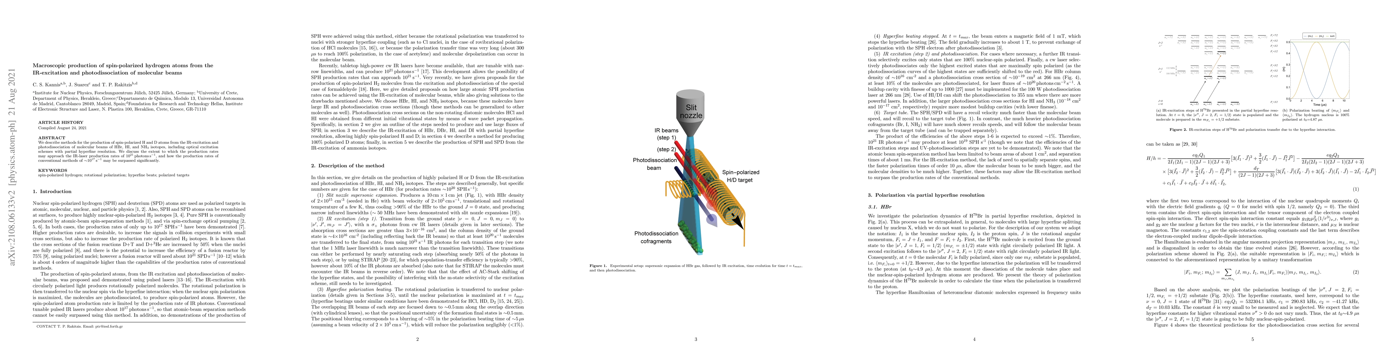 This paper details methods for generating spin-polarized hydrogen and deuterium atoms via IR-excitation and photodissociation of molecular beams, aiming to surpass conventional production rates by leveraging IR-laser techniques. The study explores the feasibility of achieving production rates close to $10^{21}\, \text{photons}\, \text{s}^{-1}$.
