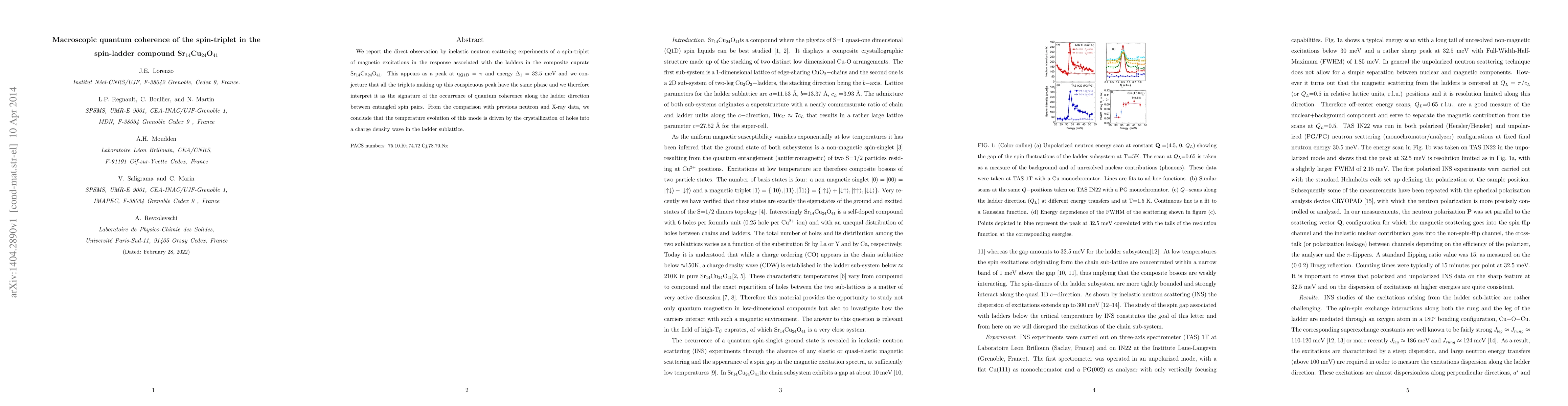 We report the direct observation by inelastic neutron scattering experiments of a spin triplet of magnetic excitations in the response associated with the ladders in the composite cuprate Sr14Cu24O41. This appears as a peak at q_{Q1D}=\pi and energy \Delta_1=32.5 meV, and we conjecture that all the triplets making up this conspicuous peak have the same phase and therefore interpret it as the signature of the occurrence of quantum coherence along the ladder direction between entangled spin pairs. From the comparison with previous neutron and x-ray data, we conclude that the temperature evolution of this mode is driven by the crystallization of holes into a charge density wave in the ladder sublattice
