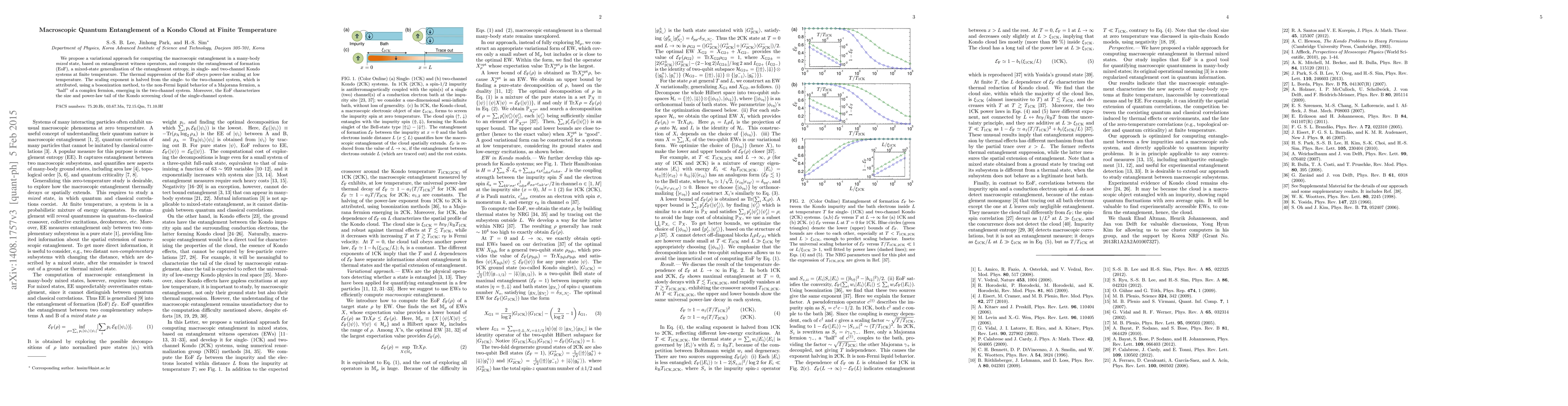 This paper proposes a variational method to compute macroscopic entanglement in many-body mixed states, specifically in Kondo systems, and finds that the entanglement of formation scales with temperature, exhibiting a halved exponent in two-channel systems due to the non-Fermi liquid behavior of Majorana fermions. The entanglement also characterizes the Kondo screening cloud's size and tail.