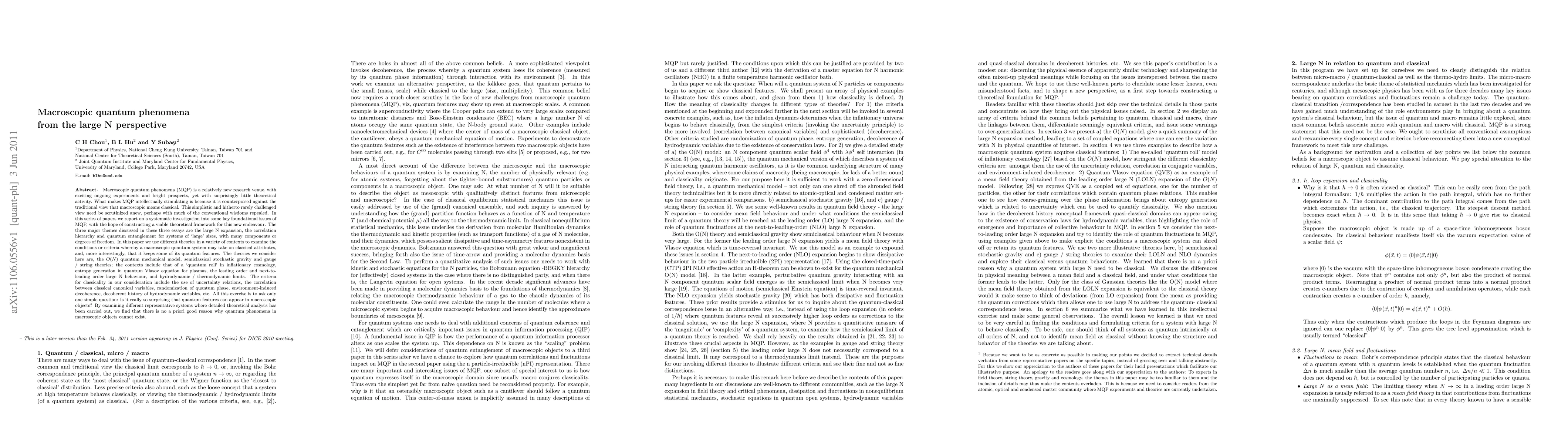 This paper explores macroscopic quantum phenomena (MQP) using the large N expansion, correlation hierarchy, and quantum entanglement, finding that quantum features can persist in macroscopic systems despite classical attributes. Various theoretical frameworks and contexts are examined to understand the conditions under which MQP can occur.