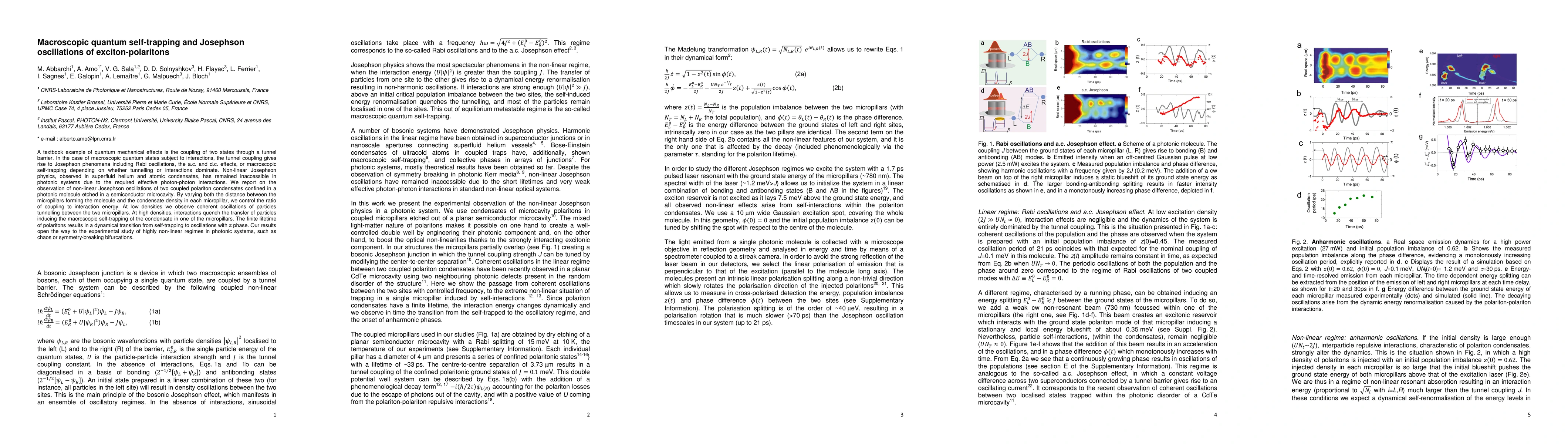 This paper reports the observation of non-linear Josephson oscillations in exciton-polariton condensates within a photonic molecule, demonstrating macroscopic quantum self-trapping and Rabi oscillations. The study highlights the transition from coherent tunneling to self-trapping by controlling the coupling and interaction energies.