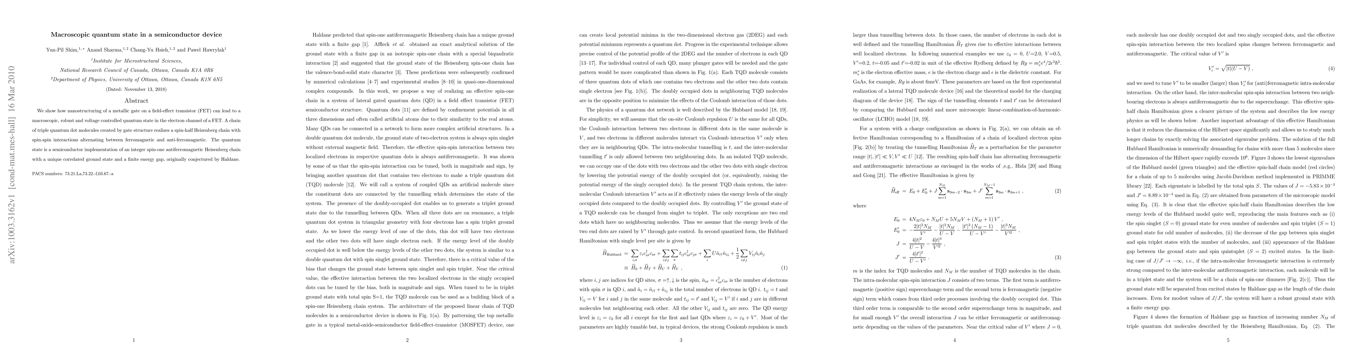 We show how nanostructuring of a metallic gate on a field-effect transistor (FET) can lead to a macroscopic, robust and voltage controlled quantum state in the electron channel of a FET. A chain of triple quantum dot molecules created by gate structure realizes a spin-half Heisenberg chain with spin-spin interactions alternating between ferromagnetic and anti-ferromagnetic. The quantum state is a semiconductor implementation of an integer spin-one antiferromagnetic Heisenberg chain with a unique correlated ground state and a finite energy gap, originally conjectured by Haldane.
