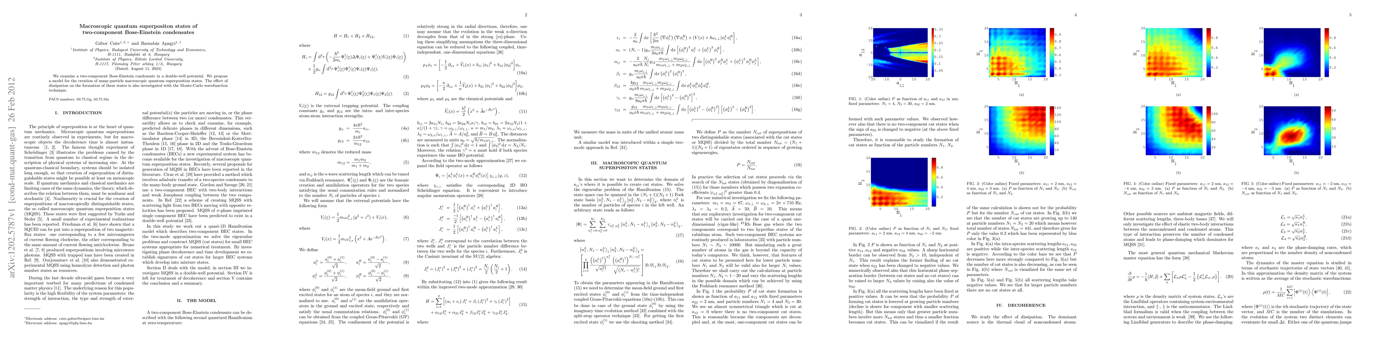 This paper investigates the creation of macroscopic quantum superposition states in a two-component Bose-Einstein condensate within a double-well potential, proposing a model for their formation and examining the impact of dissipation using the Monte-Carlo wavefunction technique.