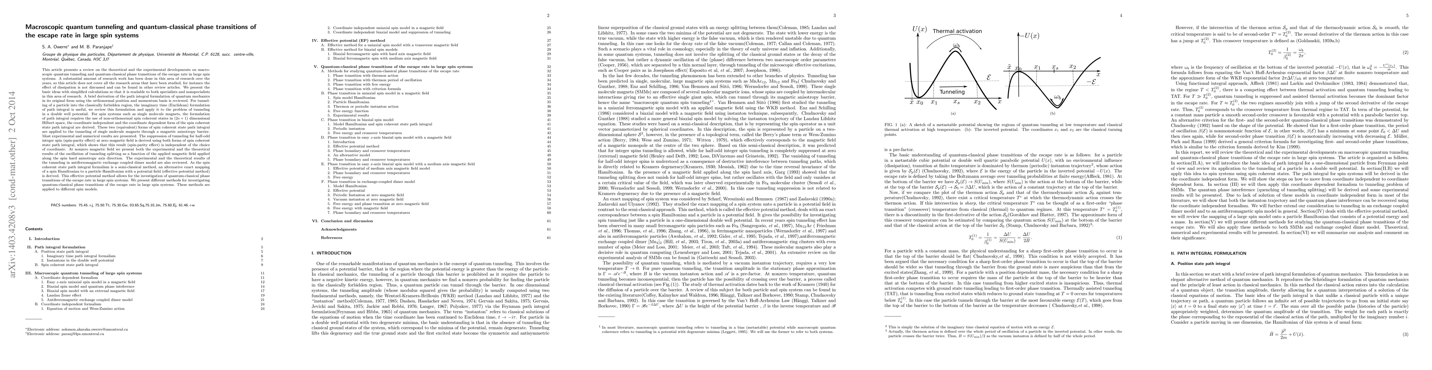 Researchers review the study of macroscopic quantum tunneling in large spin systems, revealing the suppression of tunneling for half-odd integer spins at zero magnetic field and oscillations of tunneling splitting with applied magnetic fields.