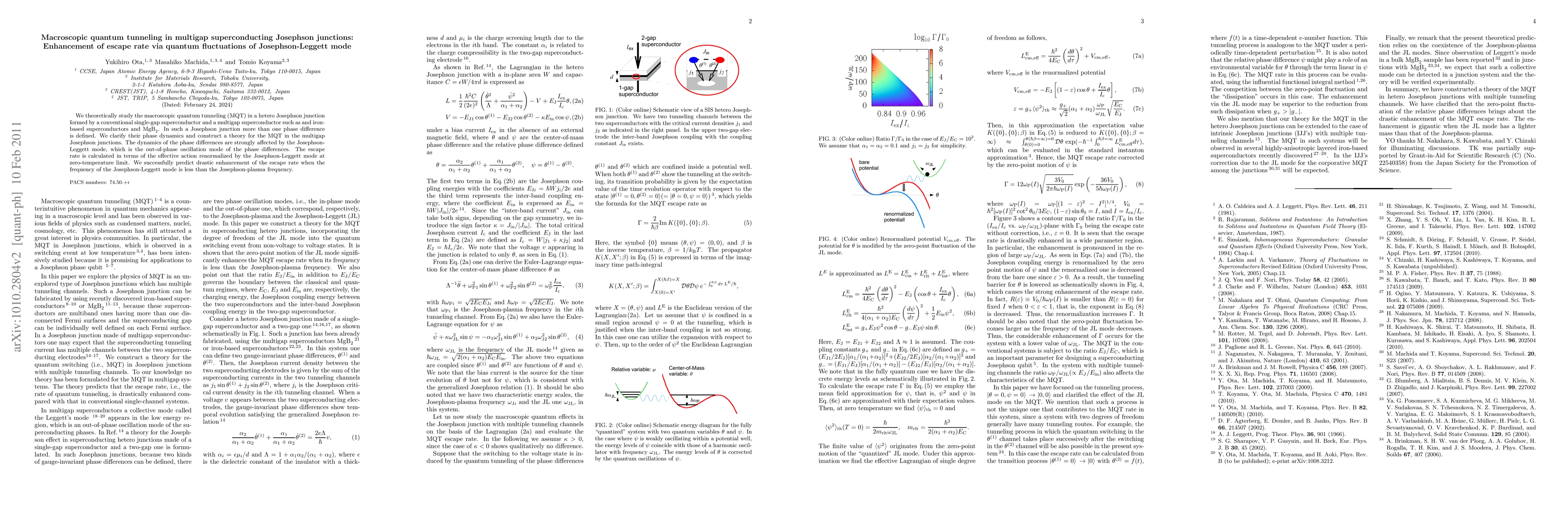 This paper theoretically investigates macroscopic quantum tunneling in hetero Josephson junctions combining conventional and multi-gap superconductors, highlighting the role of the Josephson-Leggett mode in enhancing the escape rate when its frequency is below the Josephson-plasma frequency.