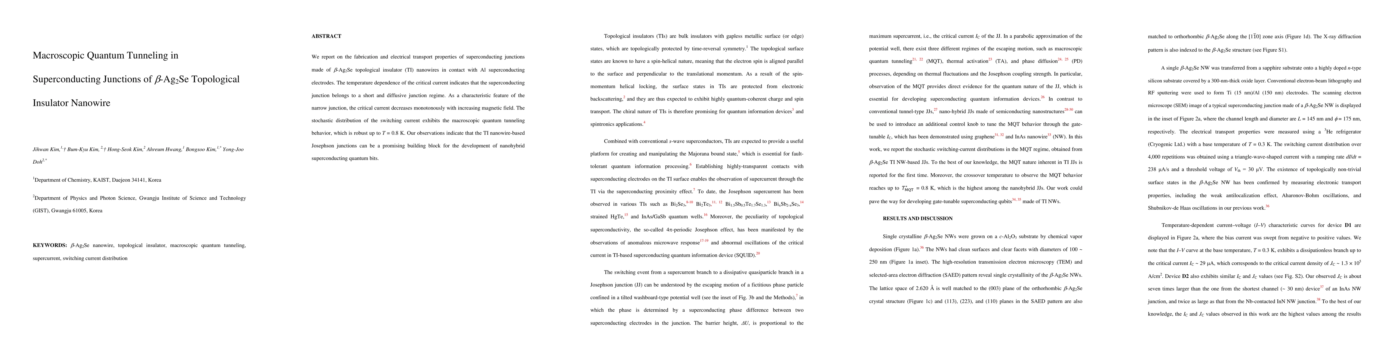 This paper investigates superconducting junctions made from β-Ag₂Se topological insulator nanowires in contact with Al electrodes, revealing macroscopic quantum tunneling behavior up to 0.8 K. The junctions exhibit short and diffusive characteristics, suggesting potential for nanohybrid superconducting quantum bit applications.