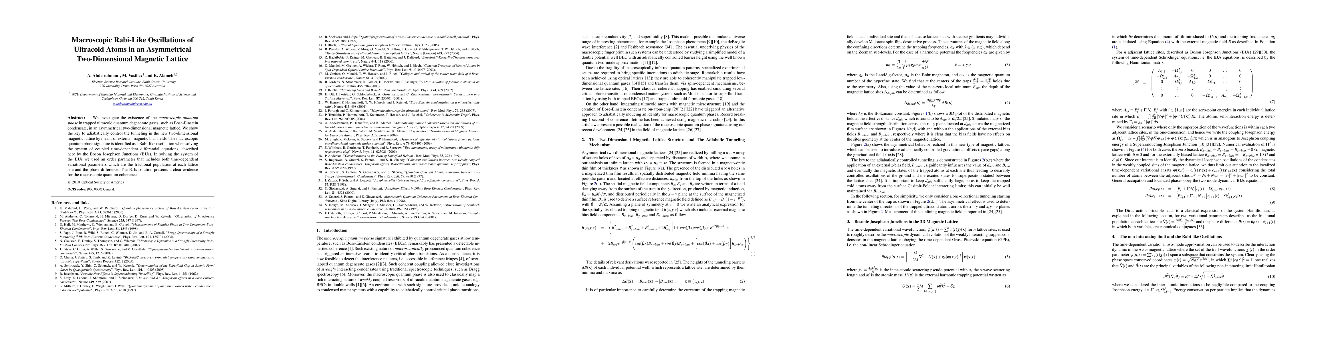We investigate the existence of the $macroscopic$ $quantum$ $phase$ in trapped ultracold quantum degenerate gases, such as Bose-Einstein condensate, in an asymmetrical two-dimensional magnetic lattice. We show the key to adiabatically control the tunneling in the new two-dimensional magnetic lattice by means of external magnetic bias fields. The macroscopic quantum phase signature is identified as a Rabi-like oscillation when solving the system of coupled time-dependent differential equations, described here by the Boson Josephson Junctions (BJJs). In solving the system of the BJJs we used an order parameter that includes both time-dependent variational parameters which are the fractional population at each lattice site and the phase difference. The BJJs solution presents a clear evidence for the macroscopic quantum coherence.