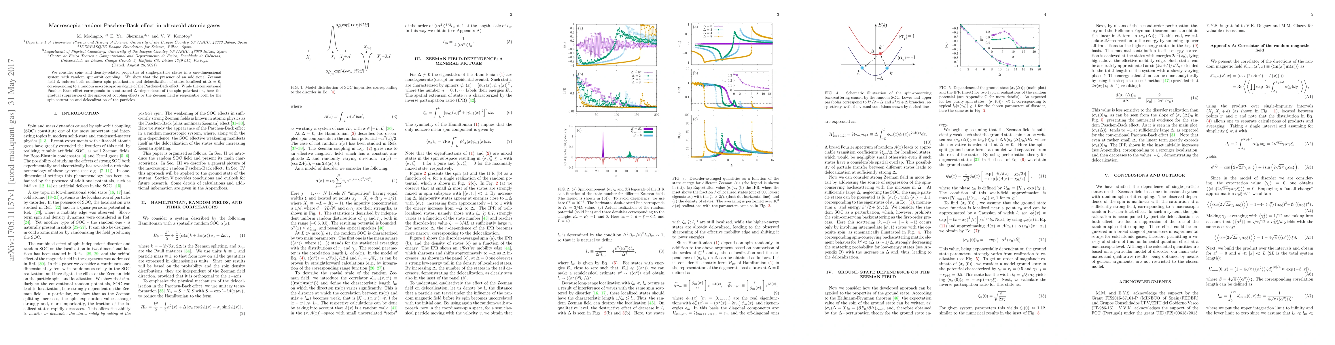 We consider spin- and density-related properties of single-particle states in a one-dimensional system with random spin-orbit coupling. We show that the presence of an additional Zeeman field $\Delta$ induces both nonlinear spin polarization and delocalization of states localized at $\Delta=0$, corresponding to a random macroscopic analogue of the Paschen-Back effect. While the conventional Paschen-Back effect corresponds to a saturated $\Delta-$dependence of the spin polarization, here the gradual suppression of the spin-orbit coupling effects by the Zeeman field is responsible both for the spin saturation and delocalization of the particles.