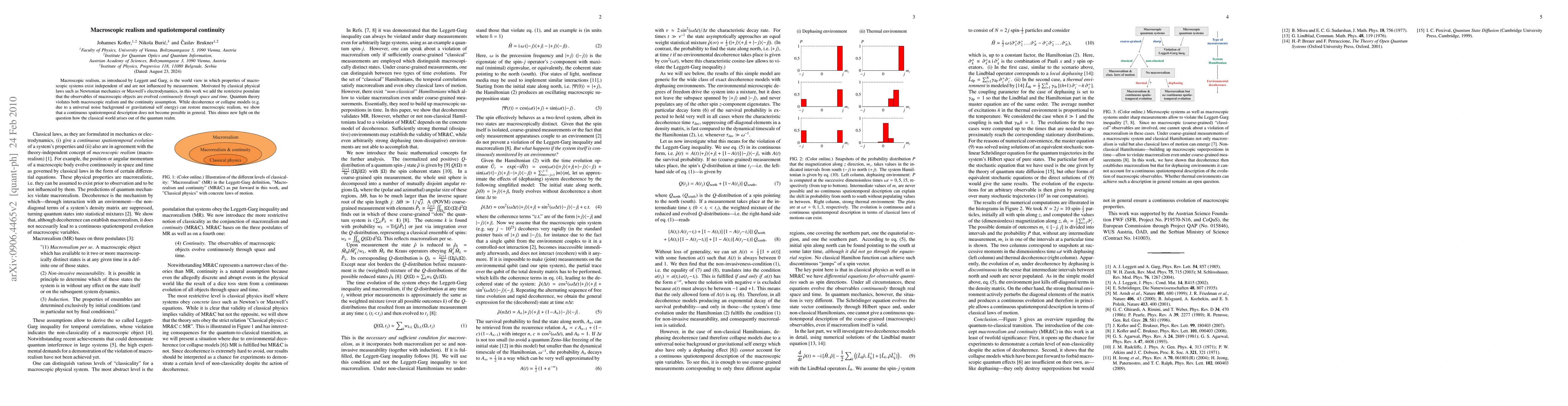 This paper explores macroscopic realism and spatiotemporal continuity, arguing that while classical physics supports macroscopic realism, quantum theory undermines it. It concludes that despite efforts to restore realism through decoherence or collapse models, a continuous spatiotemporal description remains unattainable, thus shedding light on the classical-quantum transition.