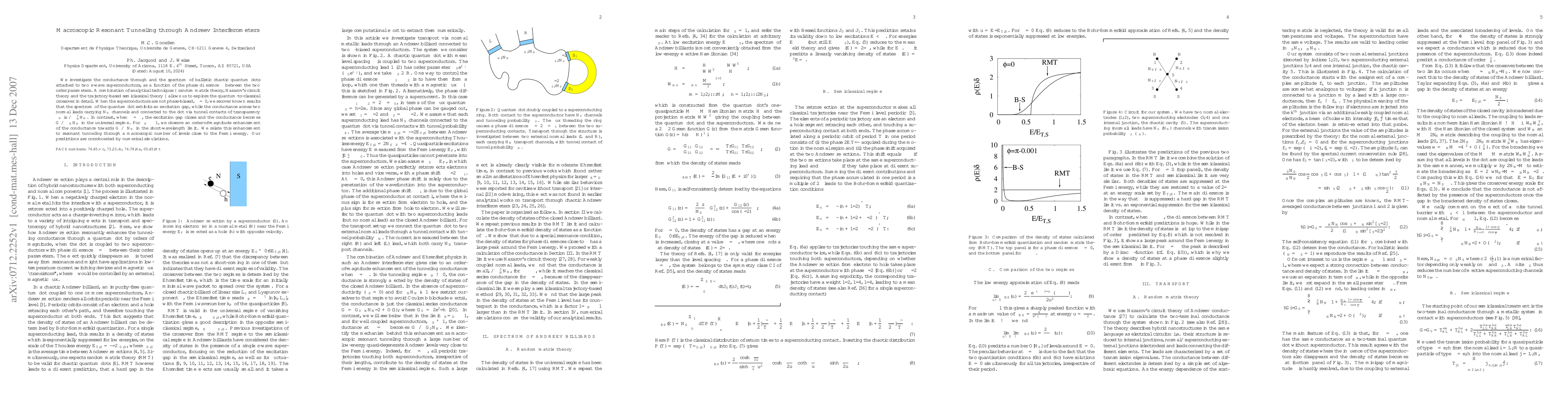 Researchers investigated how quantum dots attached to superconductors exhibit different conductance properties based on phase difference between order parameters, leading to macroscopic resonant tunneling.