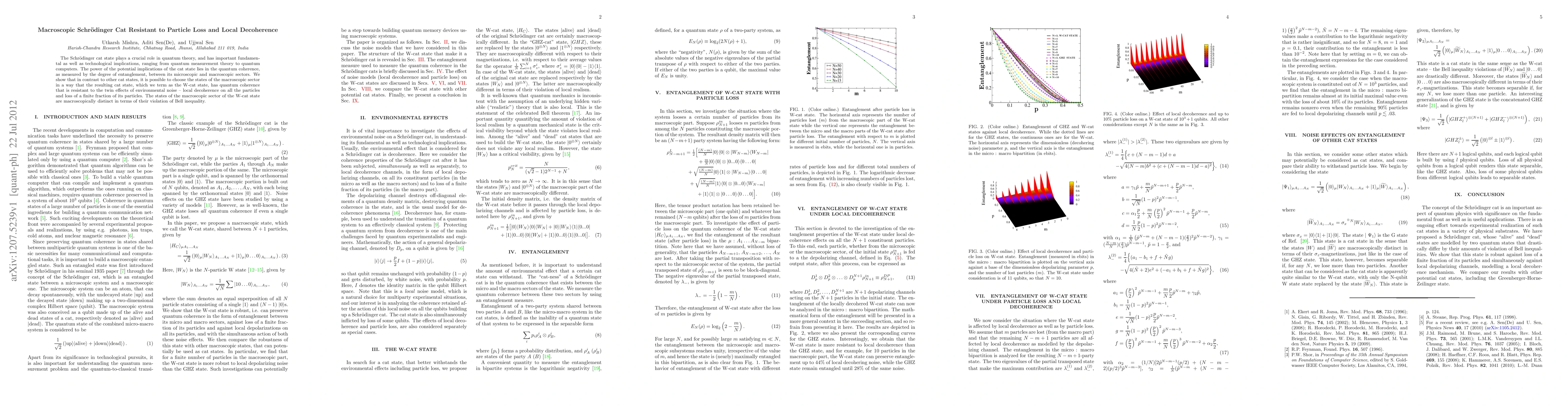 This paper demonstrates a novel W-cat state that maintains quantum coherence despite local decoherence and particle loss, contrasting with typical cat states. The W-cat state's macroscopic sector exhibits distinct properties, notably violating Bell inequalities, highlighting its potential for quantum technologies.