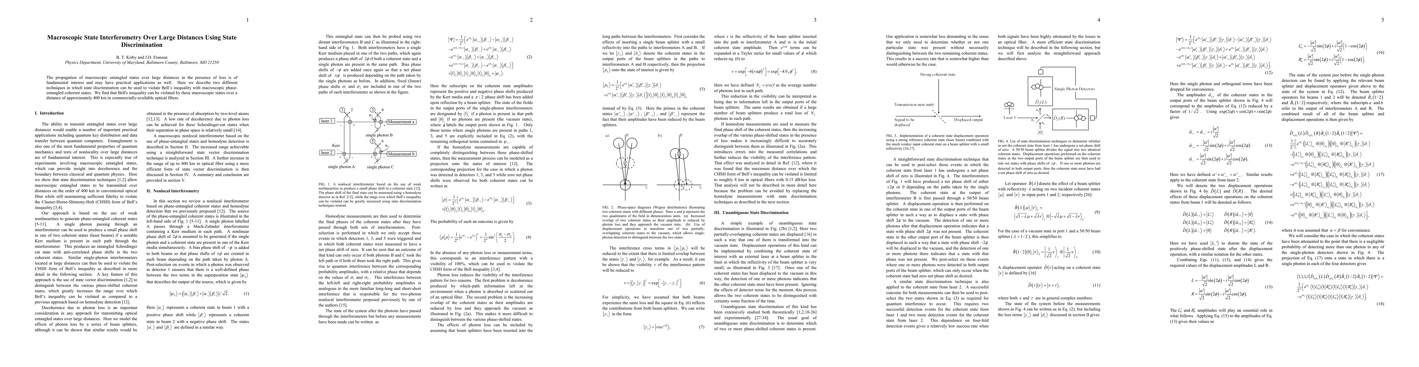 The propagation of macroscopic entangled states over large distances in the presence of loss is of fundamental interest and may have practical applications as well. Here we describe two different techniques in which state discrimination can be used to violate Bell's inequality with macroscopic phase-entangled coherent states. We find that Bell's inequality can be violated by these macroscopic states over a distance of approximately 400 km in commercially-available optical fibers.