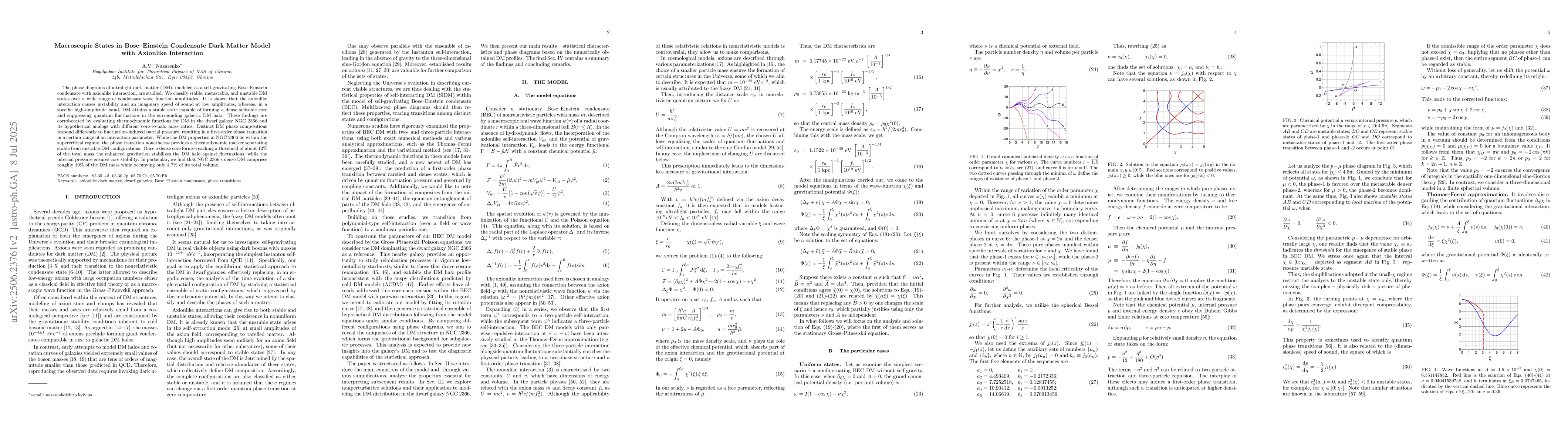 The phase diagrams of ultralight dark matter (DM), modeled as a self-gravitating Bose-Einstein condensate with axionlike interaction, are studied. We classify stable, metastable, and unstable DM states over a wide range of condensate wave function amplitudes. It is shown that the axionlike interaction causes instability and an imaginary speed of sound at low amplitudes, whereas, in a specific high-amplitude band, DM attains a stable state capable of forming a dense solitonic core and suppressing quantum fluctuations in the surrounding galactic DM halo. These findings are corroborated by evaluating thermodynamic functions for DM in the dwarf galaxy NGC2366 and its hypothetical analogs with different core-to-halo mass ratios. Distinct DM phase compositions respond differently to fluctuation-induced partial pressure, resulting in a first-order phase transition in a certain range of an interaction parameter. While the DM properties in NGC2366 lie within the supercritical regime, the phase transition nonetheless provides a thermodynamic marker separating stable from unstable DM configurations. Once a dense core forms - reaching a threshold of about 12% of the total mass - the enhanced gravitation stabilizes the DM halo against fluctuations, while the internal pressure ensures core stability. In particular, we find that NGC2366's dense DM comprises roughly 19% of the DM mass while occupying only 4.7% of its total volume.