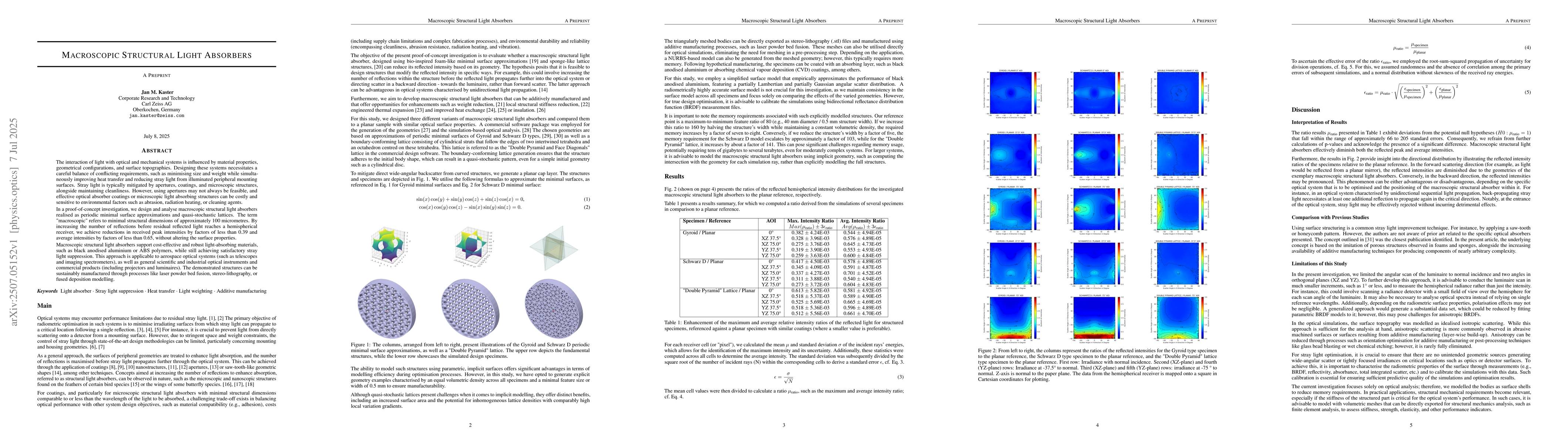 The interaction of light with optical and mechanical systems is influenced by material properties, geometrical configurations, and surface topographies. Designing these systems necessitates a careful balance of conflicting requirements, such as minimising size and weight while simultaneously improving heat transfer and reducing stray light from illuminated peripheral mounting surfaces. Stray light is typically mitigated by apertures, coatings, and microscopic structures, alongside maintaining cleanliness. However, using apertures may not always be feasible, and effective optical absorber coatings or microscopic light absorbing structures can be costly and sensitive to environmental factors such as abrasion, radiation heating, or cleaning agents. In a proof-of-concept investigation, we design and analyse macroscopic structural light absorbers realised as periodic minimal surface approximations and quasi-stochastic lattices. The term "macroscopic" refers to minimal structural dimensions of approximately 100 micrometres. By increasing the number of reflections before residual reflected light reaches a hemispherical receiver, we achieve reductions in received peak intensities by factors of less than 0.39 and average intensities by factors of less than 0.65, without altering the surface properties. Macroscopic structural light absorbers support cost-effective and robust light-absorbing materials, such as black anodised aluminium or ABS polymers, while still achieving satisfactory stray light suppression. This approach is applicable to aerospace optical systems (such as telescopes and imaging spectrometers), as well as general scientific and industrial optical instruments and commercial products (including projectors and luminaires). The demonstrated structures can be sustainably fabricated through additive manufacturing processes like laser powder bed fusion.