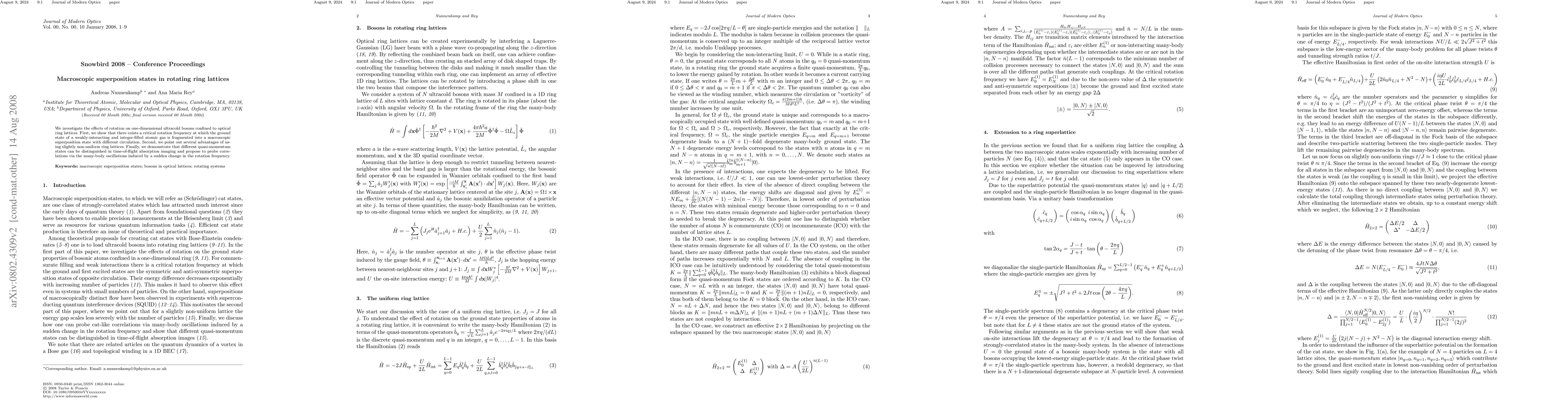 We investigate the effects of rotation on one-dimensional ultracold bosons confined to optical ring lattices. First, we show that there exists a critical rotation frequency at which the ground state of a weakly-interacting and integer-filled atomic gas is fragmented into a macroscopic superposition state with different circulation. Second, we point out several advantages of using slightly non-uniform ring lattices. Finally, we demonstrate that different quasi-momentum states can be distinguished in time-of-flight absorption imaging and propose to probe correlations via the many-body oscillations induced by a sudden change in the rotation frequency.