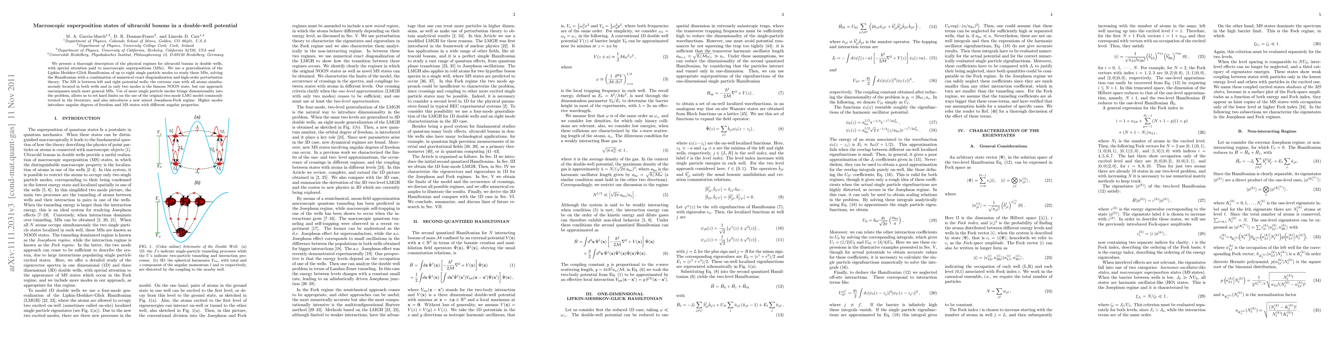 We present a thorough description of the physical regimes for ultracold bosons in double wells, with special attention paid to macroscopic superpositions (MSs). We use a generalization of the Lipkin-Meshkov-Glick Hamiltonian of up to eight single particle modes to study these MSs, solving the Hamiltonian with a combination of numerical exact diagonalization and high-order perturbation theory. The MS is between left and right potential wells; the extreme case with all atoms simultaneously located in both wells and in only two modes is the famous NOON state, but our approach encompasses much more general MSs. Use of more single particle modes brings dimensionality into the problem, allows us to set hard limits on the use of the original two-mode LMG model commonly treated in the literature, and also introduces a new mixed Josephson-Fock regime. Higher modes introduce angular degrees of freedom and MS states with different angular properties.