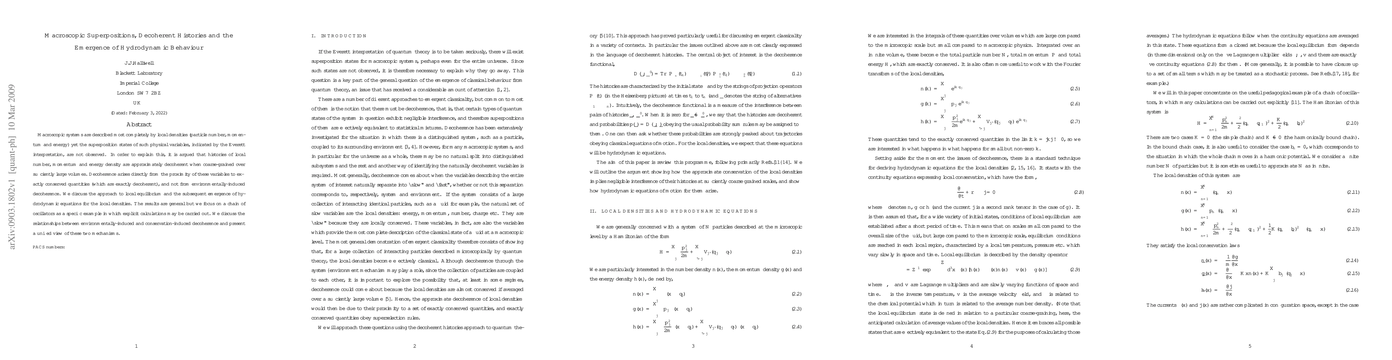 This paper explores the emergence of hydrodynamic behavior in macroscopic systems through the lens of decoherent histories, arguing that local densities' superposition states are not observed due to inherent decoherence from their proximity to conserved quantities. The study focuses on a chain of oscillators to illustrate how conservation-induced decoherence leads to local equilibrium and hydrodynamic equations.