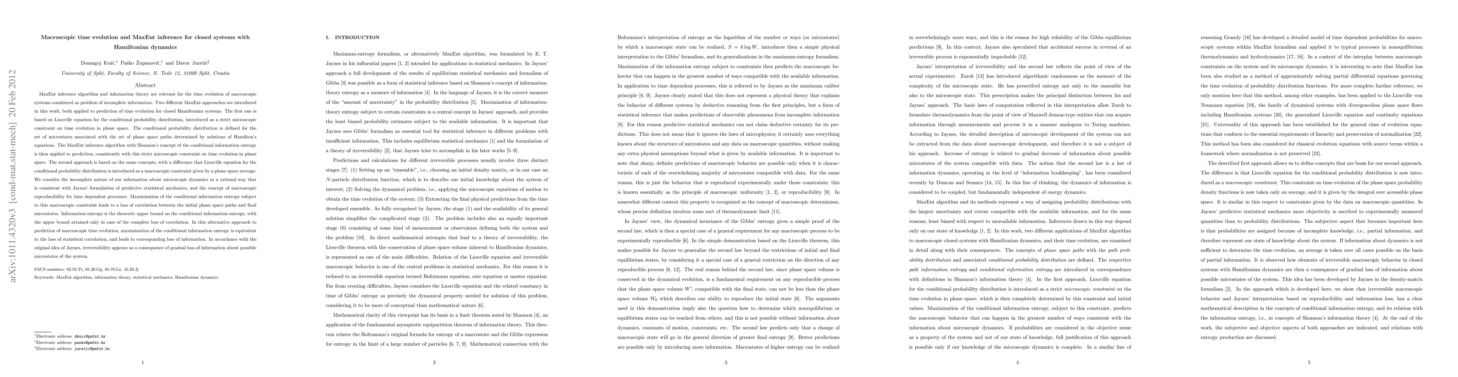 MaxEnt inference algorithm and information theory are relevant for the time evolution of macroscopic systems considered as problem of incomplete information. Two different MaxEnt approaches are introduced in this work, both applied to prediction of time evolution for closed Hamiltonian systems. The first one is based on Liouville equation for the conditional probability distribution, introduced as a strict microscopic constraint on time evolution in phase space. The conditional probability distribution is defined for the set of microstates associated with the set of phase space paths determined by solutions of Hamilton's equations. The MaxEnt inference algorithm with Shannon's concept of the conditional information entropy is then applied to prediction, consistently with this strict microscopic constraint on time evolution in phase space. The second approach is based on the same concepts, with a difference that Liouville equation for the conditional probability distribution is introduced as a macroscopic constraint given by a phase space average. We consider the incomplete nature of our information about microscopic dynamics in a rational way that is consistent with Jaynes' formulation of predictive statistical mechanics. Maximization of the conditional information entropy subject to this macroscopic constraint leads to a loss of correlation between the initial phase space paths and final microstates. Information entropy is the theoretic upper bound on the conditional information entropy, with the upper bound attained only in case of the complete loss of correlation. In this alternative approach to prediction of macroscopic time evolution, maximization of the conditional information entropy is equivalent to the loss of statistical correlation. In accordance with Jaynes, irreversibility appears as a consequence of gradual loss of information about possible microstates of the system.