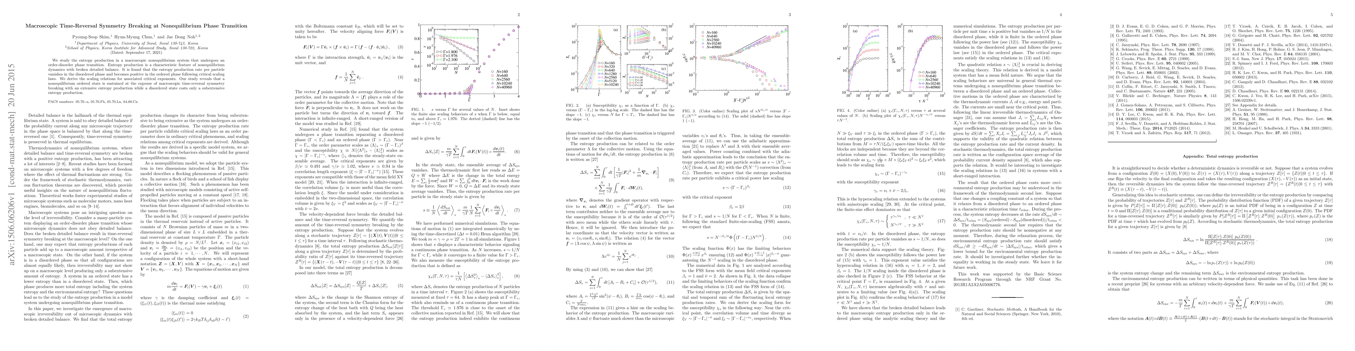 This paper investigates entropy production in a macroscopic nonequilibrium system undergoing an order-disorder phase transition, finding that entropy production vanishes in the disordered phase and becomes positive in the ordered phase following critical scaling laws. The study reveals that the ordered state sustains itself through macroscopic time-reversal symmetry breaking and extensive entropy production, contrasting with the subextensive entropy production of the disordered state.
