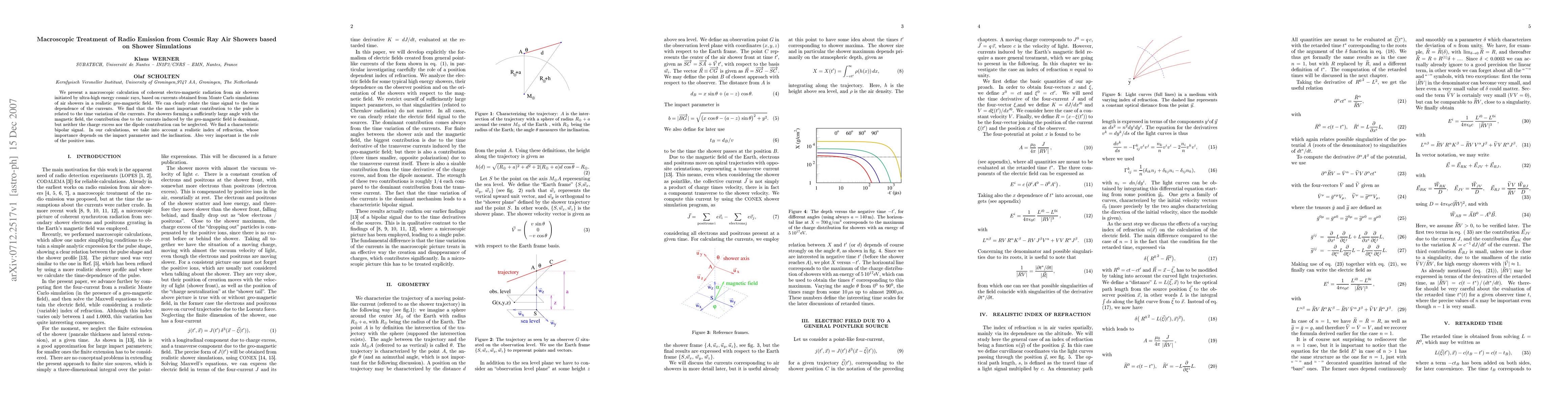 We present a macroscopic calculation of coherent electro-magnetic radiation from air showers initiated by ultra-high energy cosmic rays, based on currents obtained from Monte Carlo simulations of air showers in a realistic geo-magnetic field. We can clearly relate the time signal to the time dependence of the currents. We find that the the most important contribution to the pulse is related to the time variation of the currents. For showers forming a sufficiently large angle with the magnetic field, the contribution due to the currents induced by the geo-magnetic field is dominant, but neither the charge excess nor the dipole contribution can be neglected. We find a characteristic bipolar signal. In our calculations, we take into account a realistic index of refraction, whose importance depends on the impact parameter and the inclination. Also very important is the role of the positive ions.