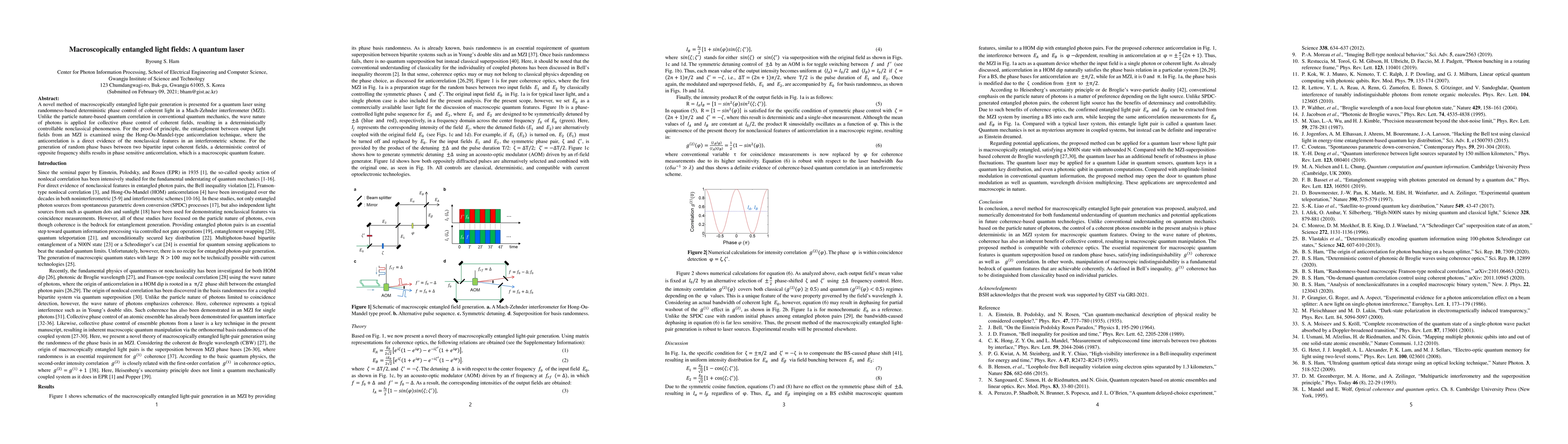 This paper presents a quantum laser technique for generating macroscopically entangled light fields through deterministic phase control in a Mach-Zehnder interferometer. The method leverages the wave nature of photons for collective phase control, demonstrating nonclassical features via Hong-Ou-Mandel-type anticorrelation, and achieving macroscopic quantum entanglement.