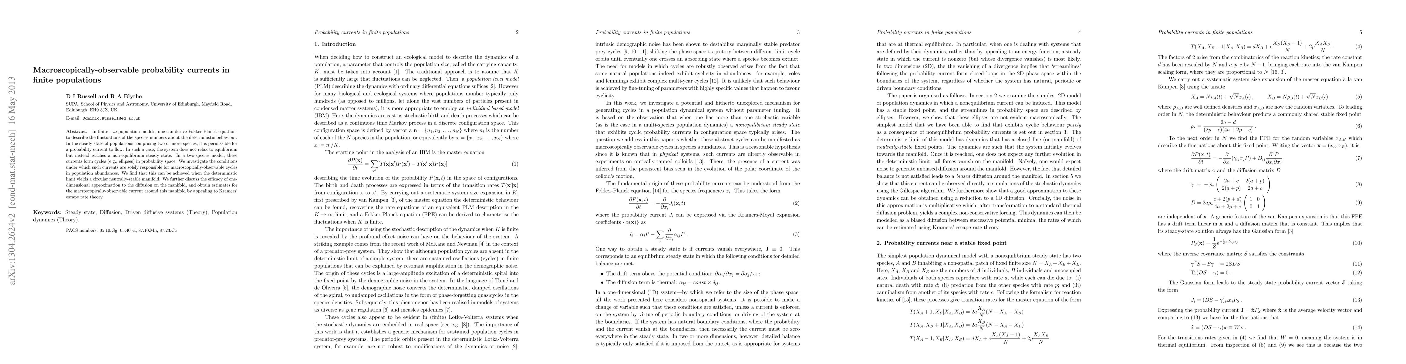 In finite-size population models, one can derive Fokker-Planck equations to describe the fluctuations of the species numbers about the deterministic behaviour. In the steady state of populations comprising two or more species, it is permissible for a probability current to flow. In such a case, the system does not relax to equilibrium but instead reaches a non-equilibrium steady state. In a two-species model, these currents form cycles (e.g., ellipses) in probability space. We investigate the conditions under which such currents are solely responsible for macroscopically-observable cycles in population abundances. We find that this can be achieved when the deterministic limit yields a circular neutrally-stable manifold. We further discuss the efficacy of one-dimensional approximation to the diffusion on the manifold, and obtain estimates for the macroscopically-observable current around this manifold by appealing to Kramers' escape rate theory.