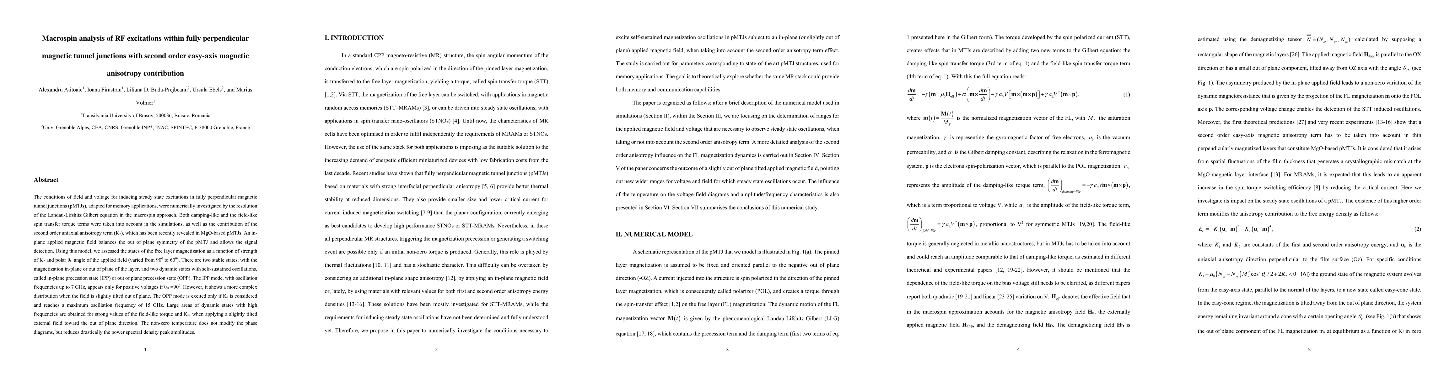 This research numerically investigates conditions for steady state excitations in fully perpendicular magnetic tunnel junctions (pMTJs) using the macrospin approach and Landau-Lifshitz-Gilbert equation. It considers damping-like and field-like spin transfer torque terms along with second-order uniaxial anisotropy (K2). The study finds two stable magnetization states (in-plane or out-of-plane) and two dynamic states (in-plane precession state, OPP) with frequencies up to 15 GHz when K2 is present. Dynamic states with high frequencies are obtained under strong field-like torque and K2 with a slightly tilted external field. Temperature effects reduce peak amplitudes but not phase diagrams.