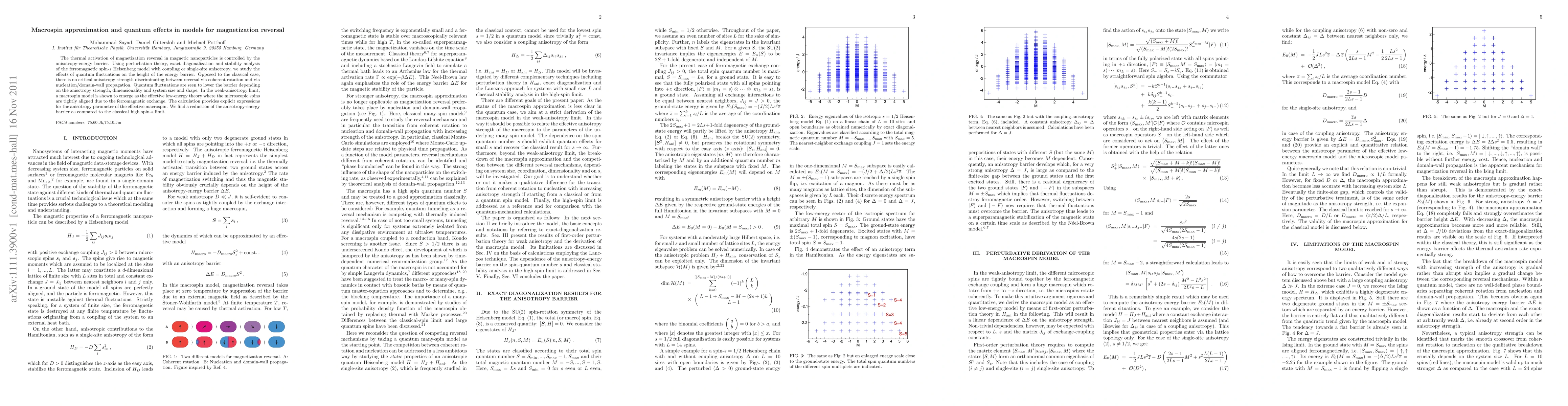 The thermal activation of magnetization reversal in magnetic nanoparticles is controlled by the anisotropy-energy barrier. Using perturbation theory, exact diagonalization and stability analysis of the ferromagnetic spin-s Heisenberg model with coupling or single-site anisotropy, we study the effects of quantum fluctuations on the height of the energy barrier. Opposed to the classical case, there is no critical anisotropy strength discriminating between reversal via coherent rotation and via nucleation/domain-wall propagation. Quantum fluctuations are seen to lower the barrier depending on the anisotropy strength, dimensionality and system size and shape. In the weak-anisotropy limit, a macrospin model is shown to emerge as the effective low-energy theory where the microscopic spins are tightly aligned due to the ferromagnetic exchange. The calculation provides explicit expressions for the anisotropy parameter of the effective macrospin. We find a reduction of the anisotropy-energy barrier as compared to the classical high spin-s limit.