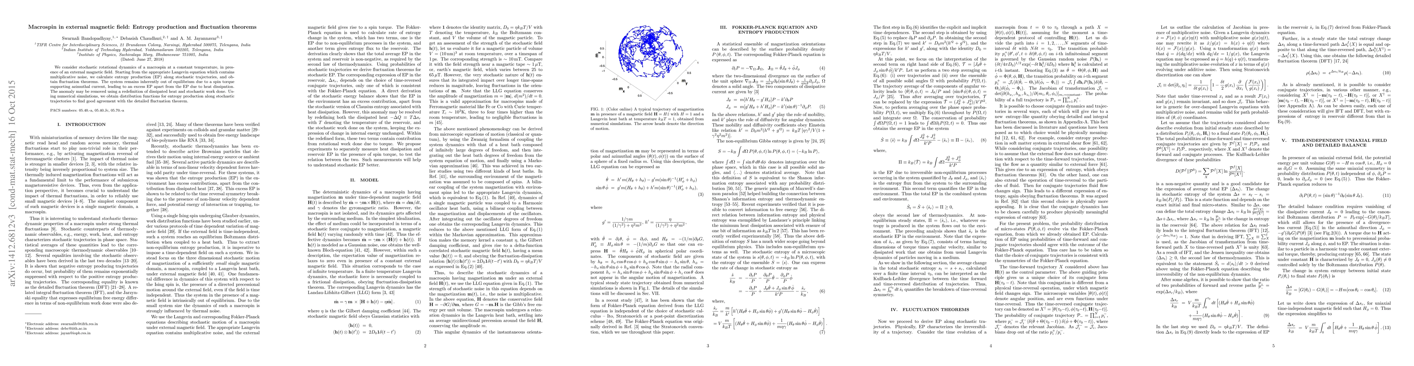 This research investigates the stochastic rotational dynamics of a macrospin in an external magnetic field, calculating entropy production and deriving fluctuation theorems. It finds that the system's excess entropy production due to a spin torque can be reconciled by redefining dissipated heat and stochastic work, supported by numerical simulations validating the fluctuation theorem.