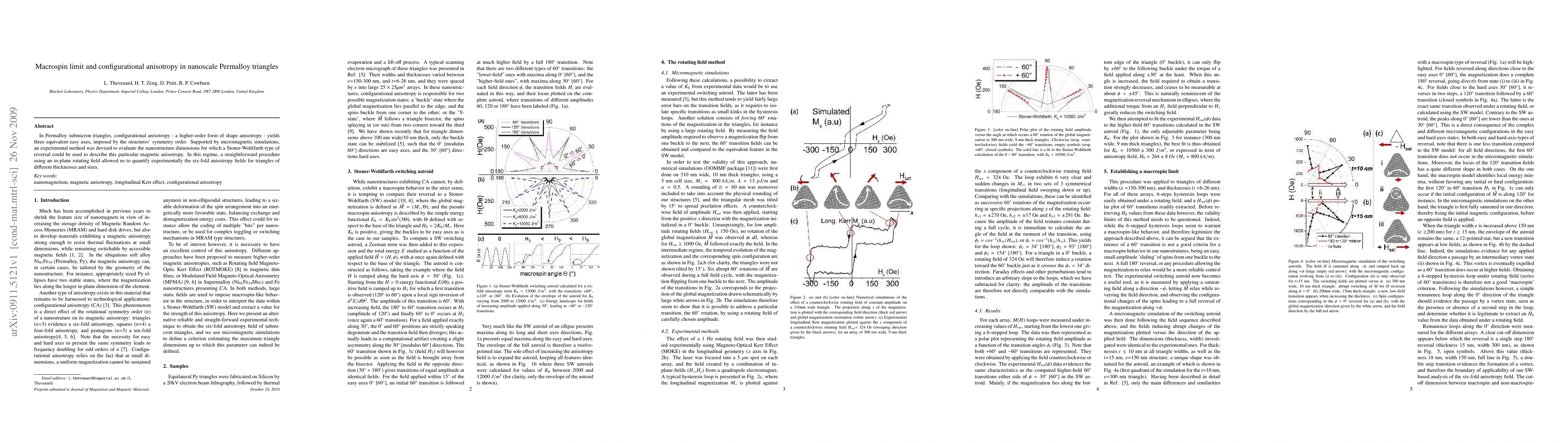 In Permalloy submicron triangles, configurational anisotropy - a higher-order form of shape anisotropy - yields three equivalent easy axes, imposed by the structures' symmetry order. Supported by micromagnetic simulations, an experimental method was devised to evaluate the nanostructure dimensions for which a Stoner-Wohlfarth type of reversal could be used to describe this particular magnetic anisotropy. In this regime, a straightforward procedure using an in-plane rotating field allowed us to quantify experimentally the six-fold anisotropy fields for triangles of different thicknesses and sizes.